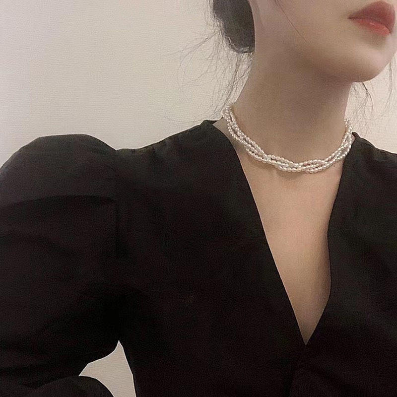 สร้อยคอมุกน้ำจืดคุณภาพสูง 3-4 มม. สำหรับ Xiaomi แบบหลายชั้น พร้อมสายห้อยชุบทอง 14K มุกสีขาว