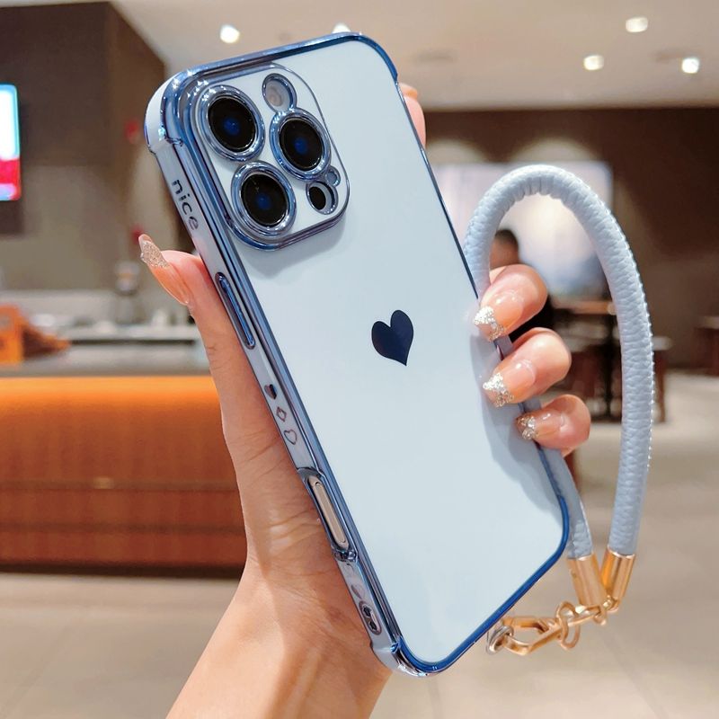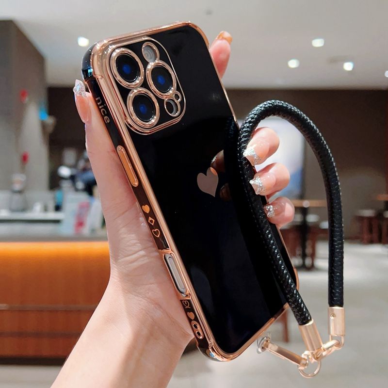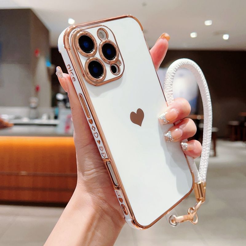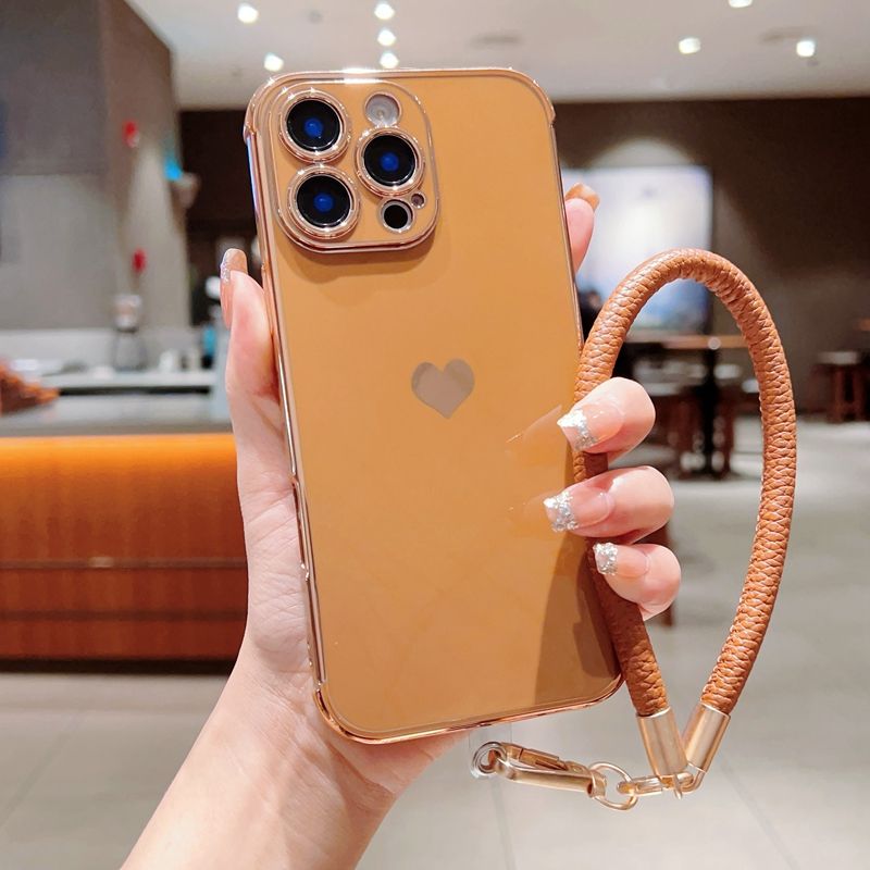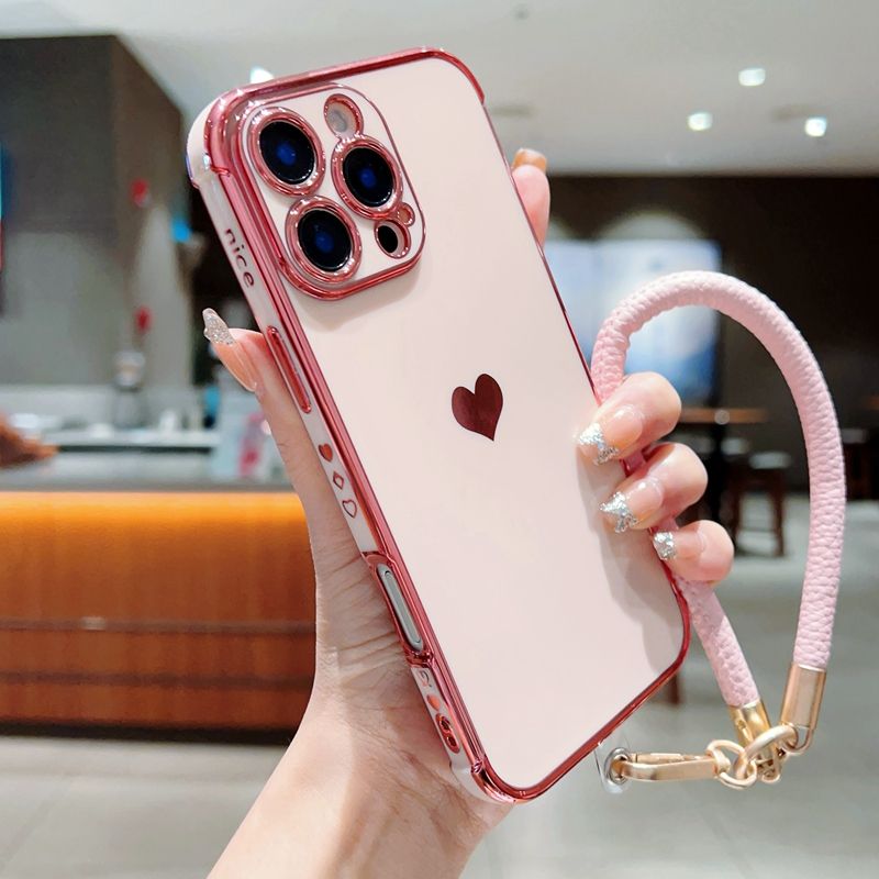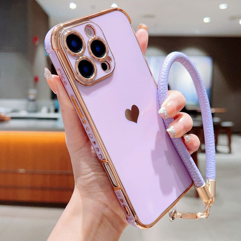 เคสโครเมียมดีไซน์รูปหัวใจพร้อมเชือก, เคสฝาหลังกันกระแทกสำหรับ iPhone 12/13 pro/ 14 plus/ 15/16 PROMAX