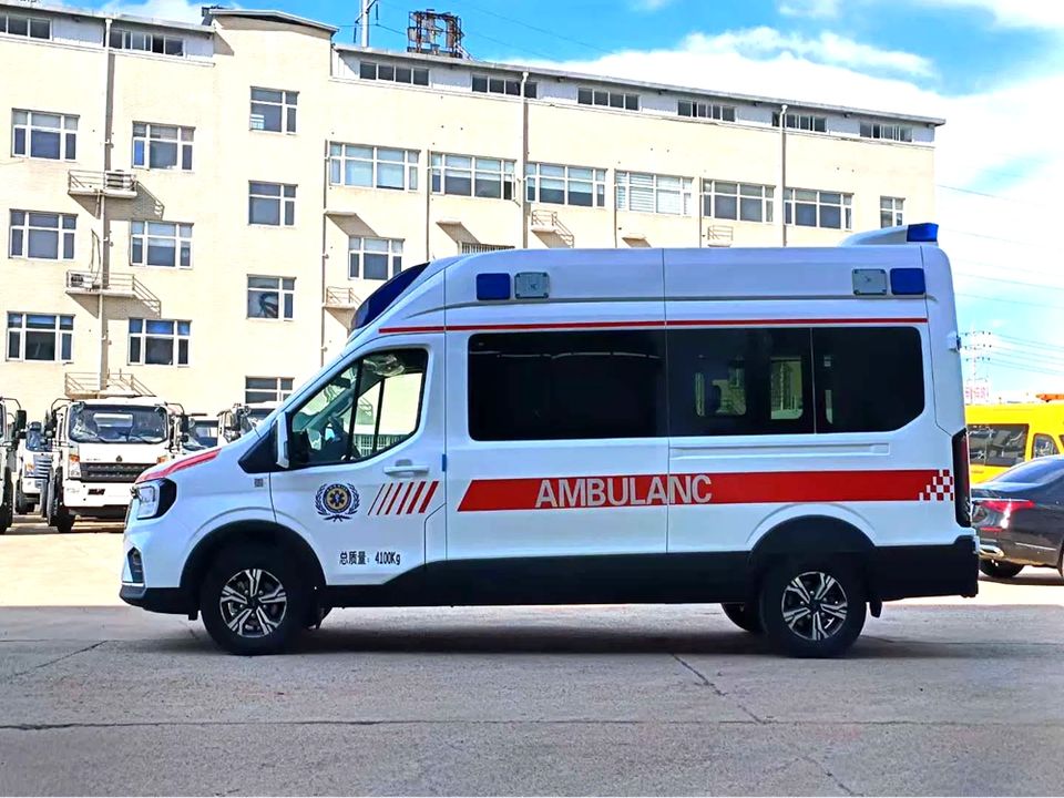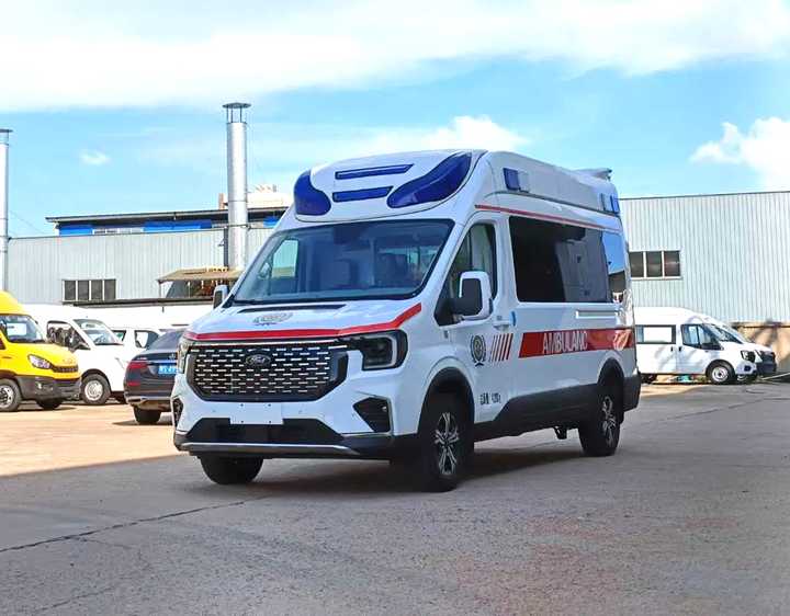 รถพยาบาลฟอร์ดหลังคาสูงพร้อมอุปกรณ์ทางการแพทย์สำหรับการขนส่งและการรักษาผู้บาดเจ็บและผู้ป่วย