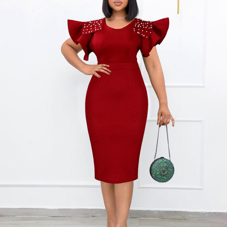 ชุดเดรสทำงานผู้หญิงไซส์ใหญ่ คอลเลคชั่นใหม่ปี 2024 คอทรงกลม แขนทรงดอกบัว แต่งลูกปัด ช่วงสะโพกทรงเอ็มไพร์ เอวสูง ใส่สบายช่วงหน้าร้อน ป้องกันไฟฟ้าสถิต