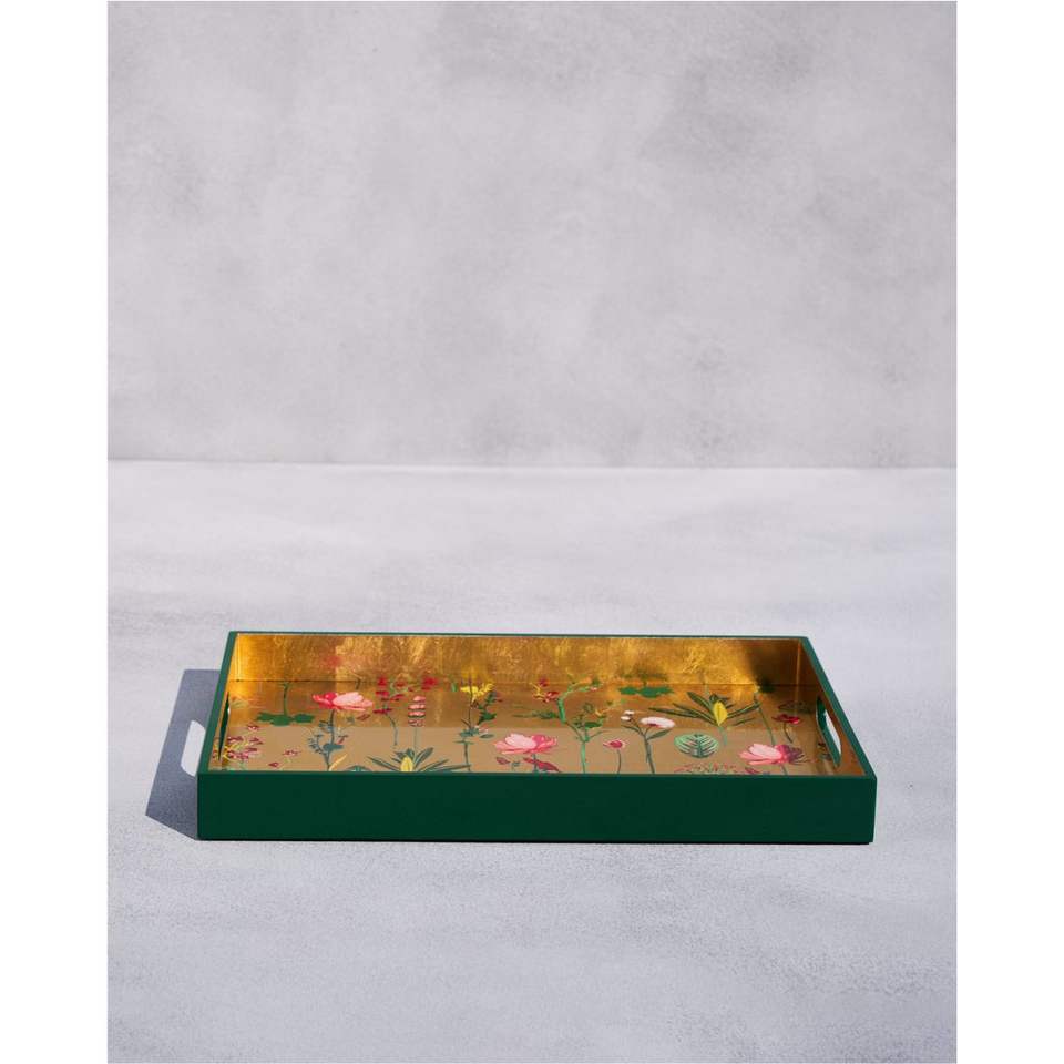 ถาดเคลือบสีเขียวป่าลายดอกไม้ประดับทองคำเปลวสำหรับเสิร์ฟเครื่องดื่ม เครื่องประดับ และของตกแต่งบ้าน