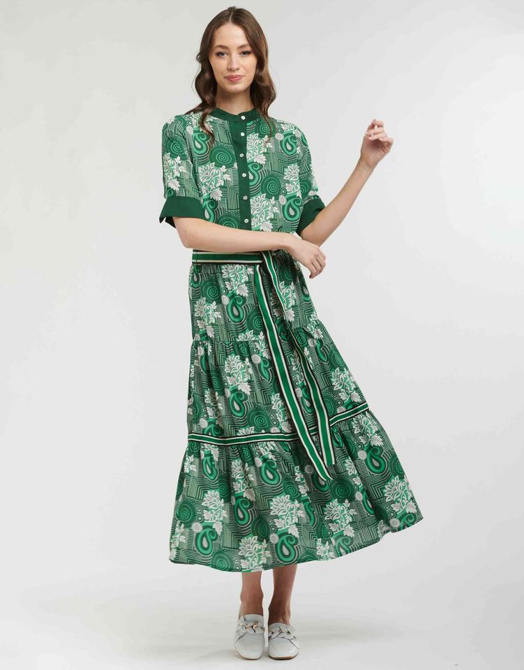 กระโปรงผู้หญิงสีเขียวป่า ดีไซน์สวยหรู ใส่สบายและใช้งานได้จริง ลายพิมพ์สวยงามและดีไซน์เป็นชั้นๆ เอวยางยืดพร้อมเชือกผูก