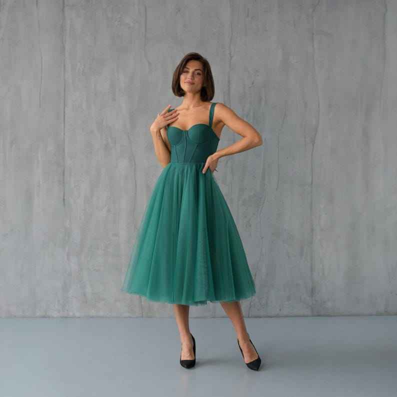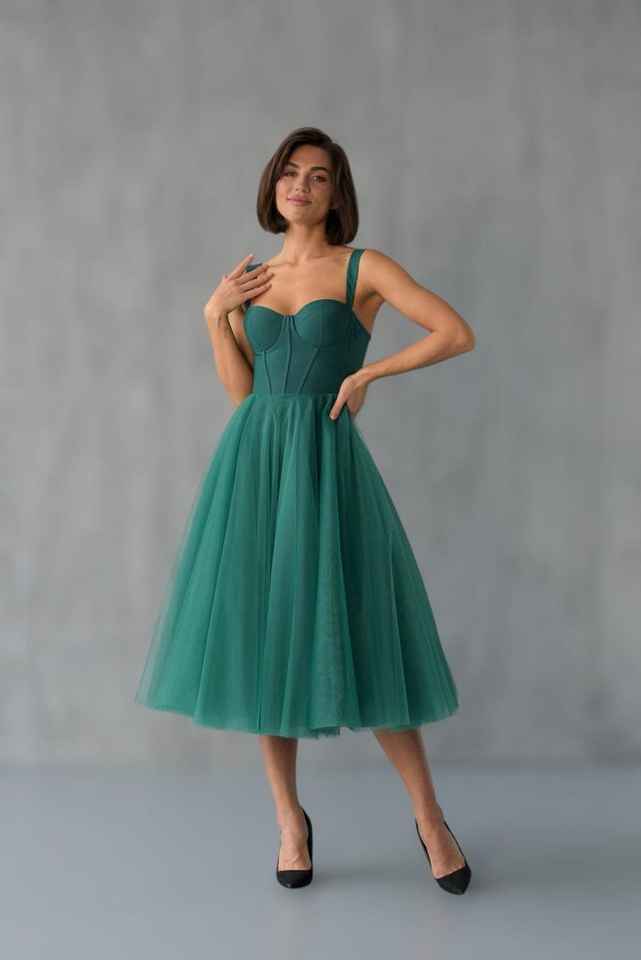ชุดเดรสงานพรอมผ้าโปร่งสีเขียวป่าคอร์เซ็ทมิดิชุดราตรีสำหรับงานรับปริญญาในเทพนิยายชุดเดรสออกงานปาร์ตี้ที่สง่างามสำหรับผู้หญิงขนาด S M
