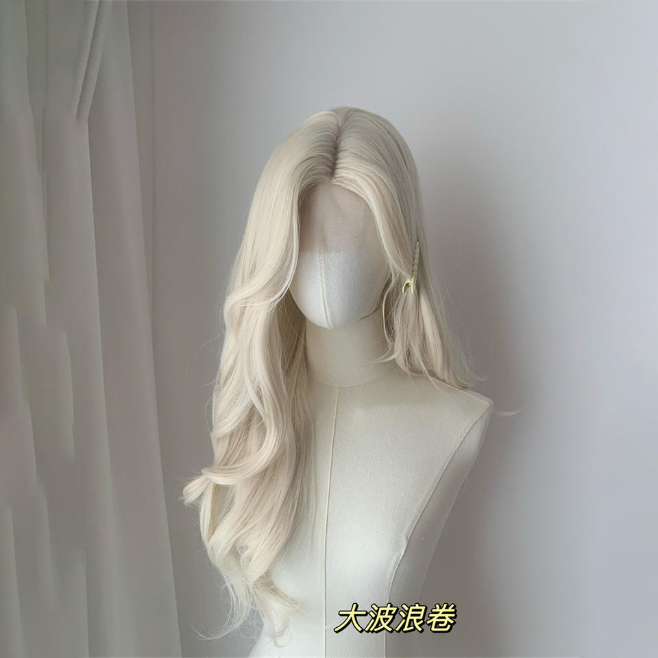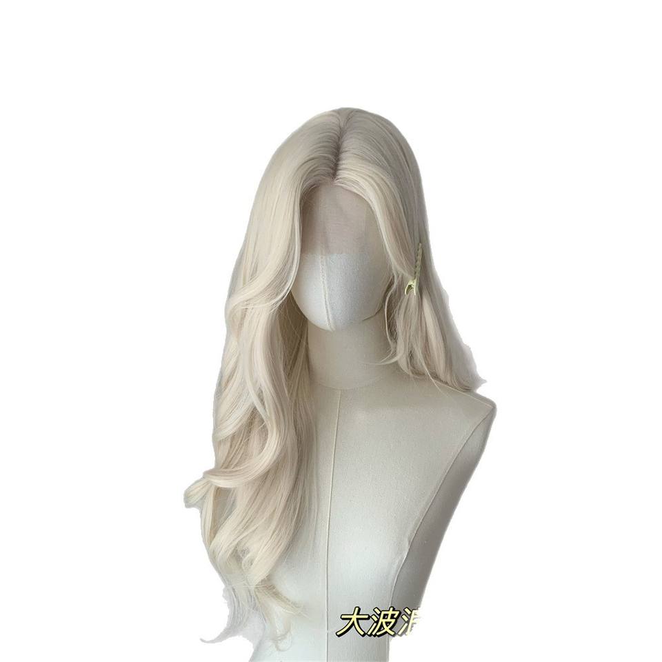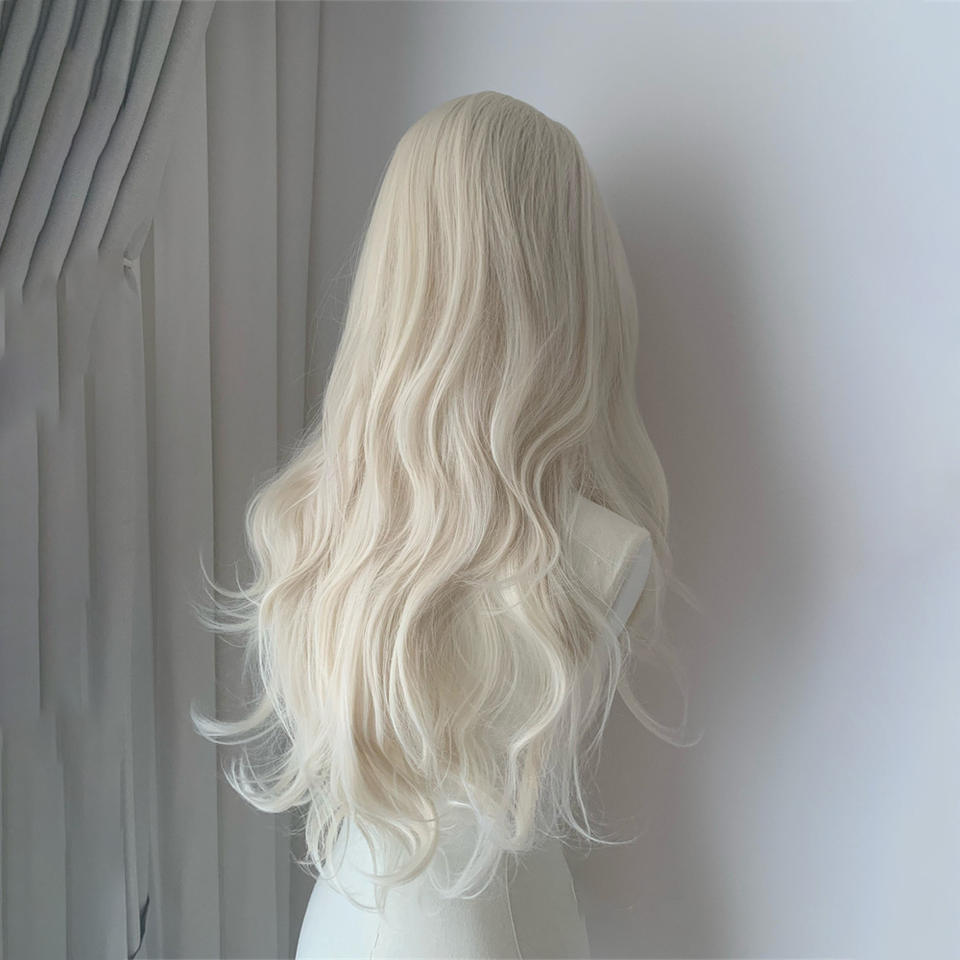วิกผมลูกไม้แบบฟลอร่าสีบลอนด์แพลตตินั่ม ผมยาวเป็นลอน พร้อมหน้าม้าปัดข้าง แนวไรผมธรรมชาติ ลูกไม้โปร่งใสขนาด 13x6