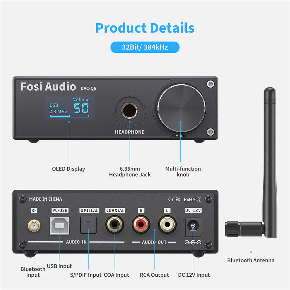 Fosi Audio Q6 USB DAC DSD256 PCM 32Bit/384kHz XMOS XU208, เครื่องขยายเสียงหูฟัง สีฟ้า 5.0 AptX HD CSR8675 ESS9018K2M Audio CB