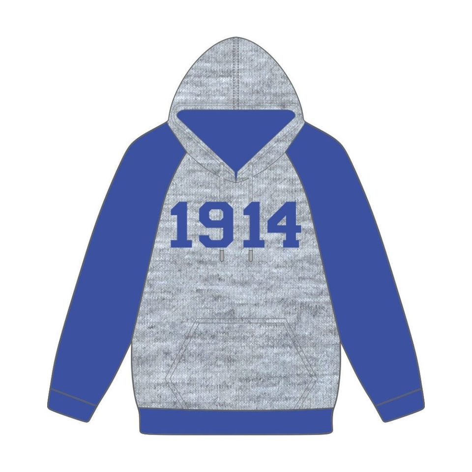 ปีก่อตั้ง 1914 ฟี เบต้า ซิกมา เสื้อฮู้ดสีเทา แขนเสื้อสีน้ำเงินแบบแร็กแลน เสื้อผ้าสำหรับสมาคมนักศึกษา แบบสั่งทำพิเศษ ดีไซน์ Divine Nine HBCU