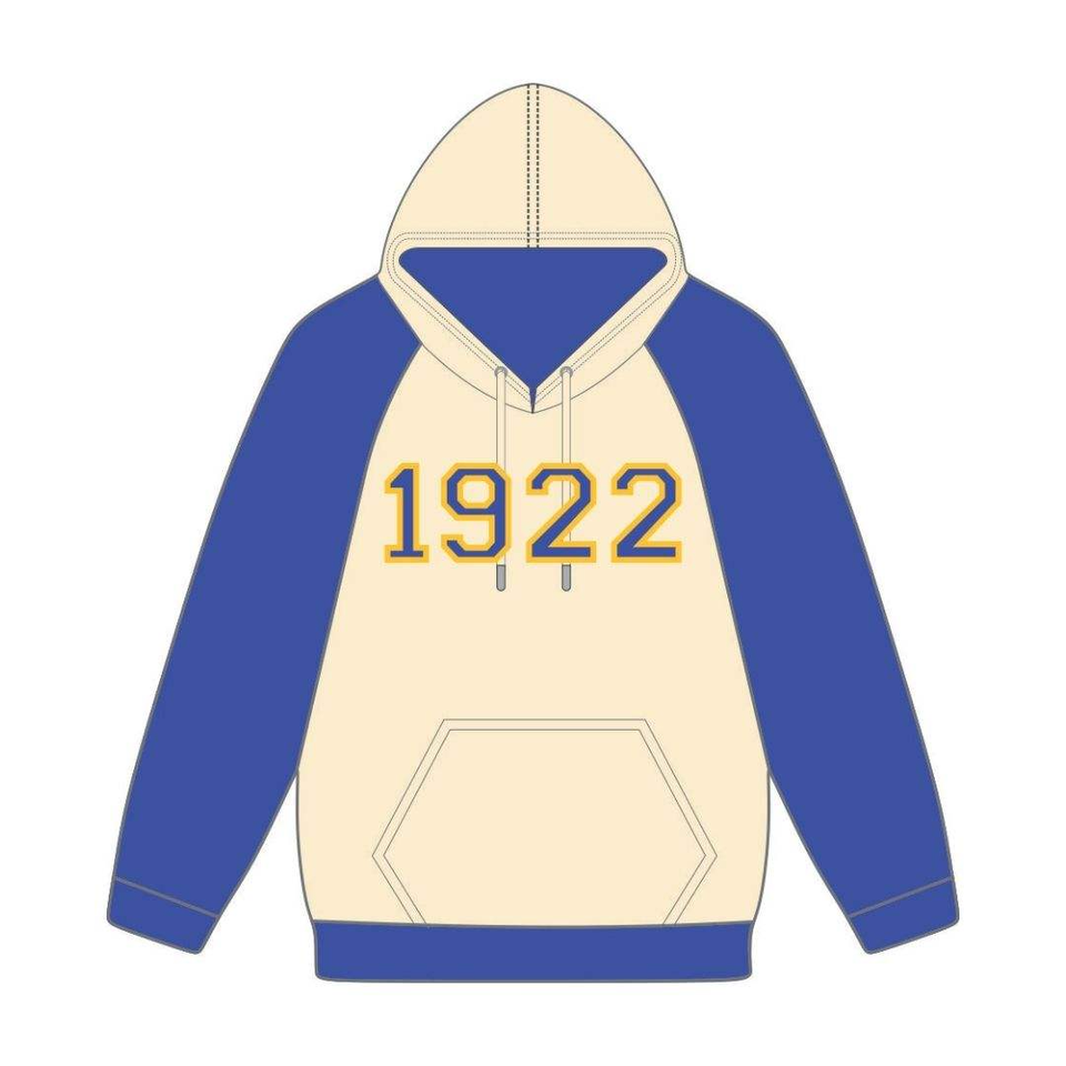 เสื้อฮู้ดแขนแร็กแลนสีน้ำเงิน ซิกมา แกมมา โร ปีก่อตั้ง 1922 เสื้อผ้าชมรมนักศึกษาหญิง SGRho ลายพิมพ์และปัก Divine Nine