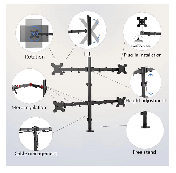 โซลูชันการติดตั้งสำหรับจอภาพสี่ตัวพร้อมฐานยึดที่แข็งแรงปรับแขนอิสระและปรับมุมมองได้อย่างราบรื่น