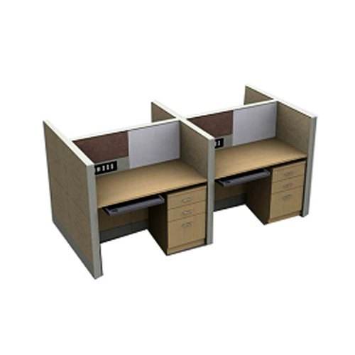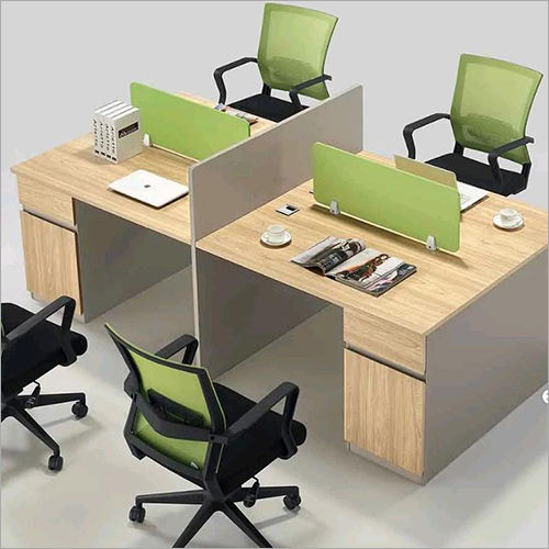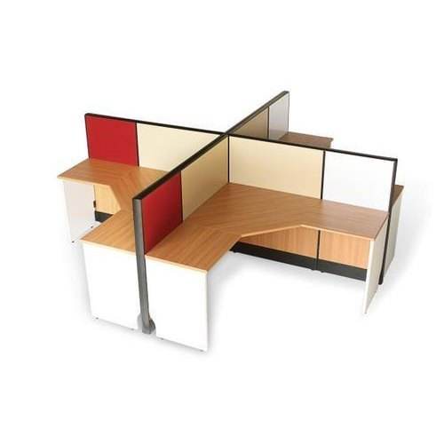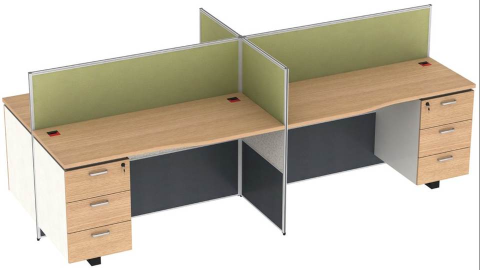 คลัสเตอร์เวิร์กสเตชันแบบแยกส่วนสี่คนพร้อมแผงความเป็นส่วนตัวหน่วยจัดเก็บข้อมูลโต๊ะทำงานโค้งและรูปแบบการออกแบบสำนักงานที่ทันสมัย