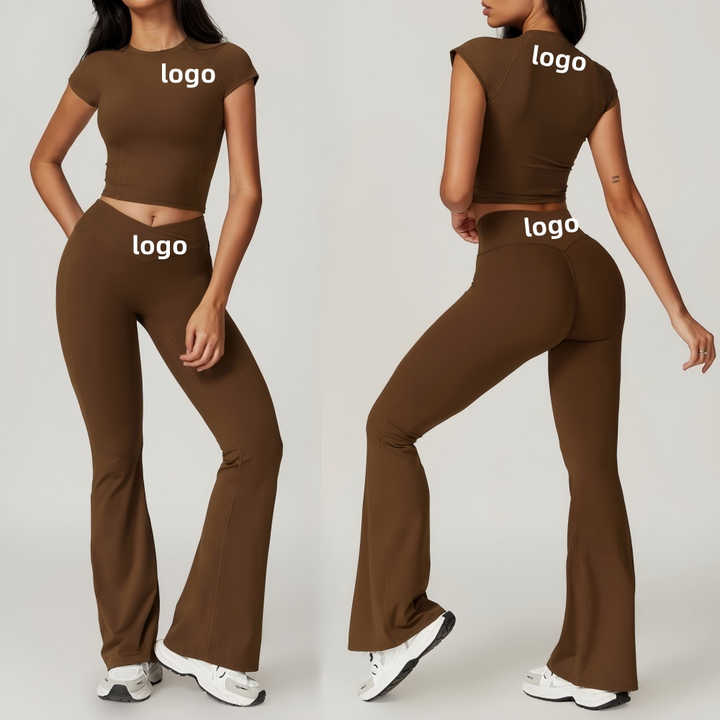 ชุดโยคะออกกำลังกายฤดูหนาวแบบยืดได้สี่ทิศทาง เสื้อแขนยาวทรงปกติ กางเกงขาบานเอววี ชุดเซ็ต 2 ชิ้น สำหรับผู้หญิง ผ้าฝ้ายฟลีซ 100%