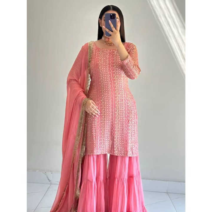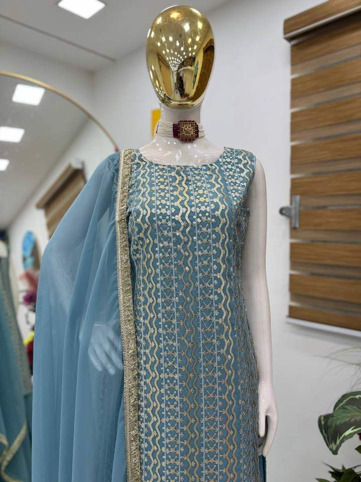 ชุดสูทสำเร็จรูป Fox Georgette พร้อมกางเกงปาลาซโซ่ทรงบานกว้าง 1.8 เมตร และเสื้อปักลายประดับเลื่อม สำหรับโชว์รูมเสื้อผ้าชาติพันธุ์