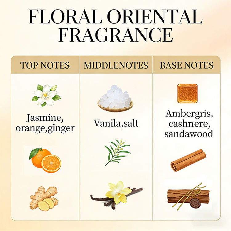 มะลิ, ส้ม, ขิง, วานิลลา, เกลือ, แอมเบอร์กริส, แคชเนอร์, ไม้จันทน์ส่วนผสม