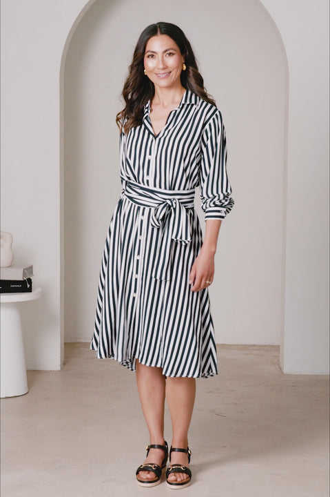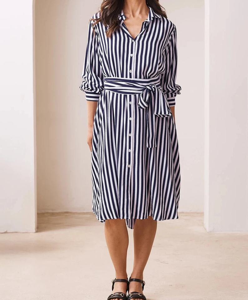 ชุดเดรสลายทางแขนยาวฟรานเชสก้า ผ้าเรยอนสีกรมท่าและสีขาว นุ่มสบาย