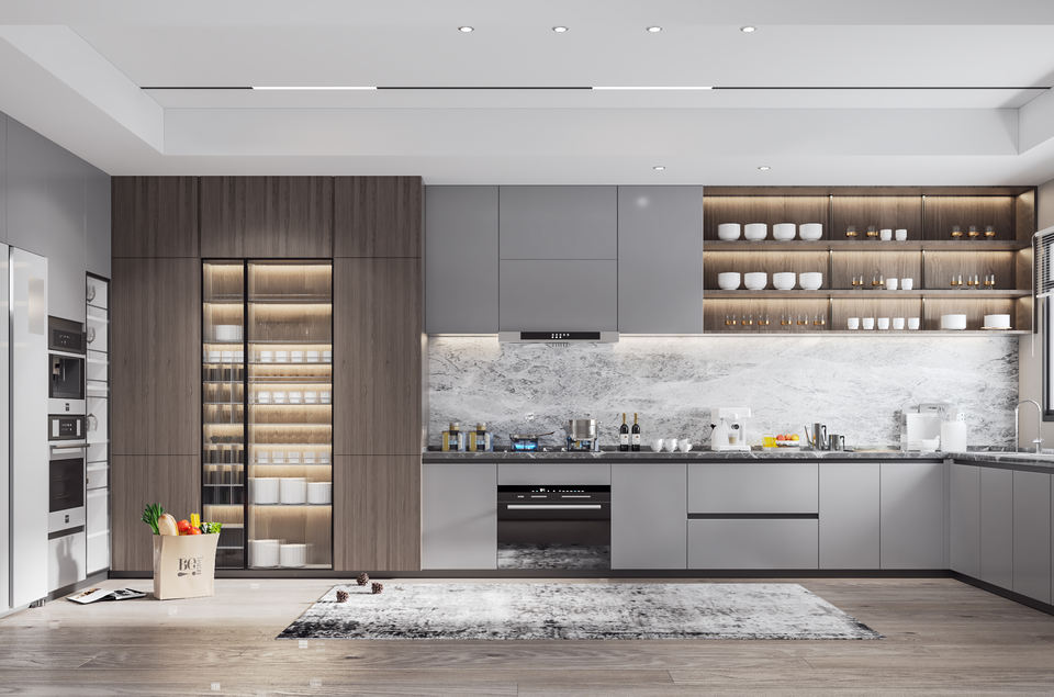 ชุดตู้ครัวโมเดิร์นสีขาวแบบกำหนดเองได้ฟรี พร้อมอ่างล้างจานและไอส์แลนด์ จากประเทศจีน