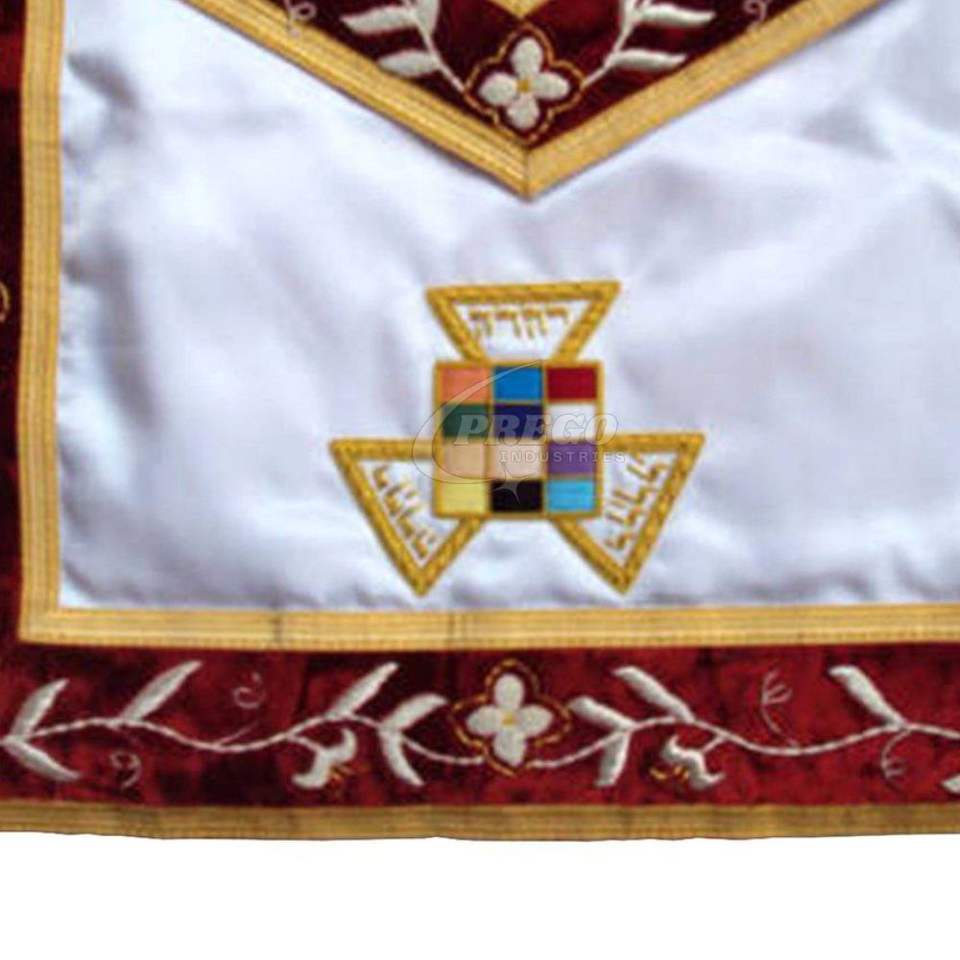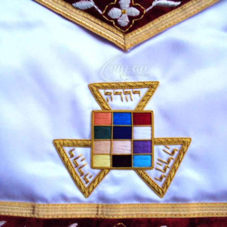ผ้ากันเปื้อนพิธีกรรมฟรีเมสันระดับพระสูตรหลวง รอยัลอาร์ช ชั้นสูงสุด - ผ้าไหมซาตินสีขาวและผ้ากำมะหยี่สีแดง