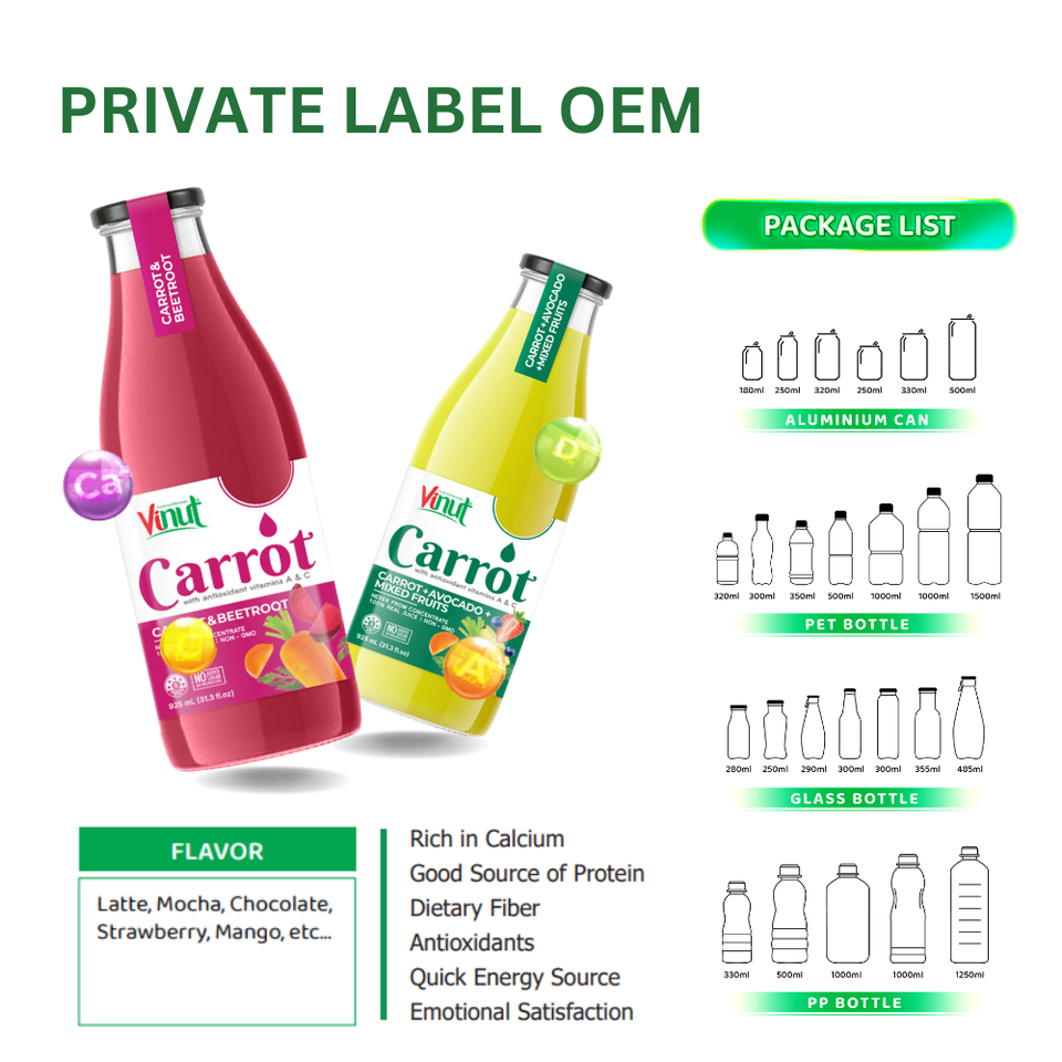 ตัวอย่างฟรี - น้ำผลไม้แท้ 100% ผสมแครอทและส้ม 925 มล. บรรจุขวดแก้ว - รับผลิตแบบ OEM แบรนด์ส่วนตัว - ผลิตเครื่องดื่มจากเวียดนาม