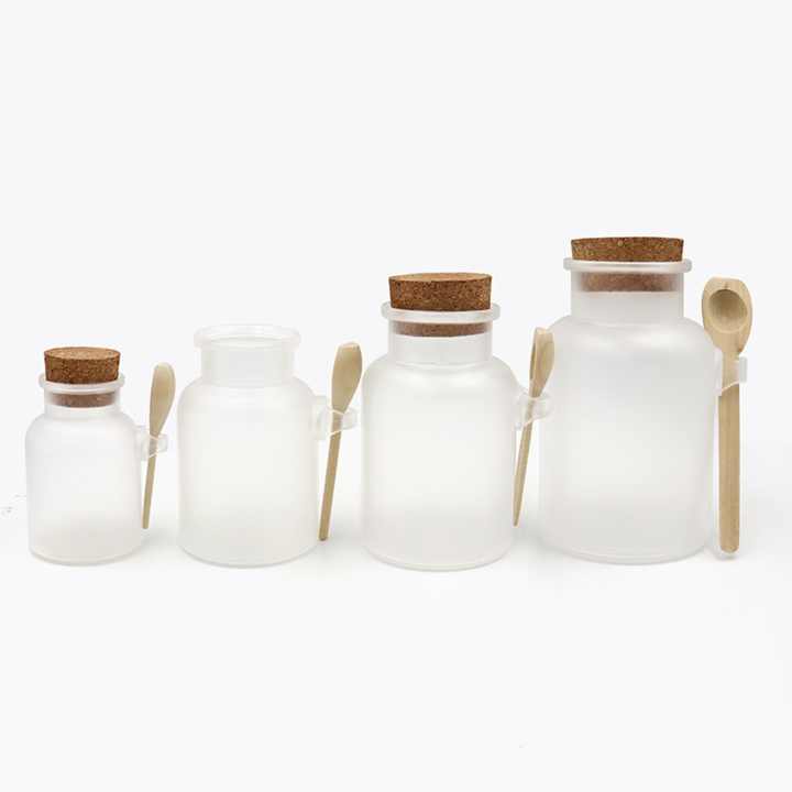 ขวดเกลืออาบน้ำแบบใสขุ่น ABS ขนาด 100 มล. 200 มล. 300 มล. พร้อมฝาไม้และช้อนไม้สำหรับสครับขัดผิว มีสินค้าในสต็อก ตัวอย่างฟรี
