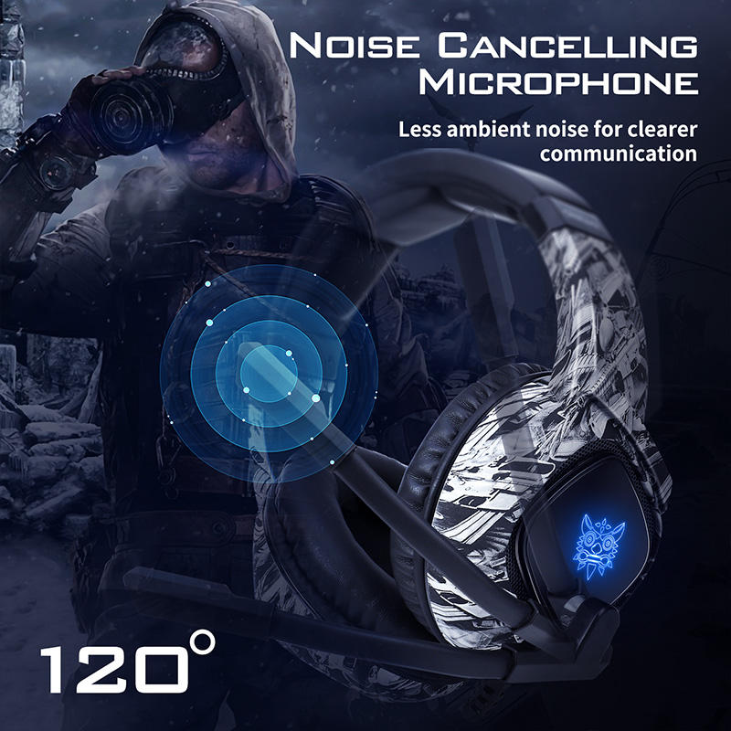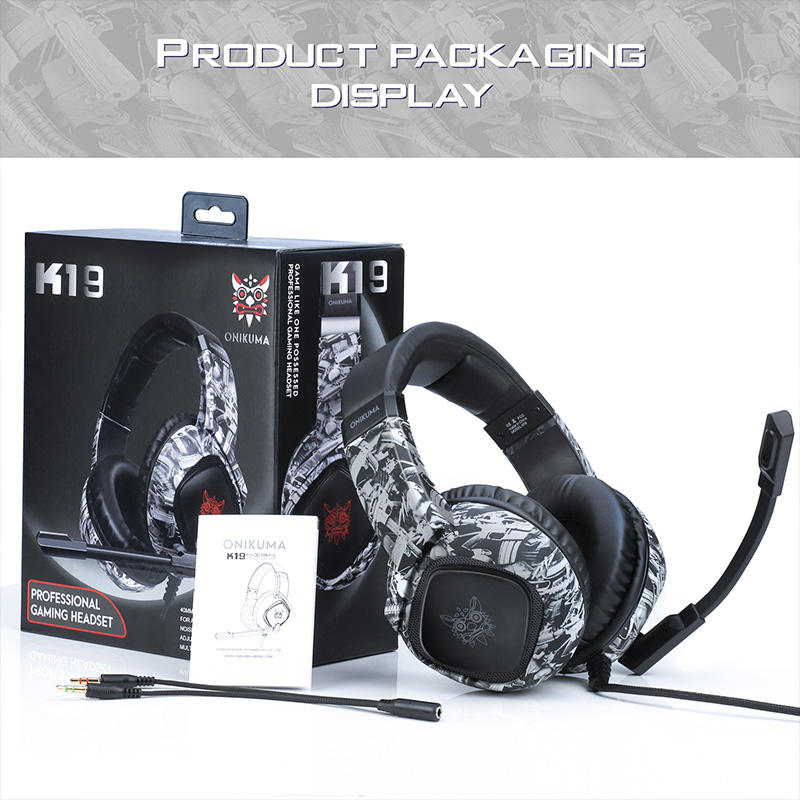 หูฟังเกมมิ่งแบบมีสาย ONIKUMA K19 สีเทาลายพรางหิมะ พร้อมระบบตัดเสียงรบกวนและไฟ RGB ตัวอย่างสินค้าฟรี