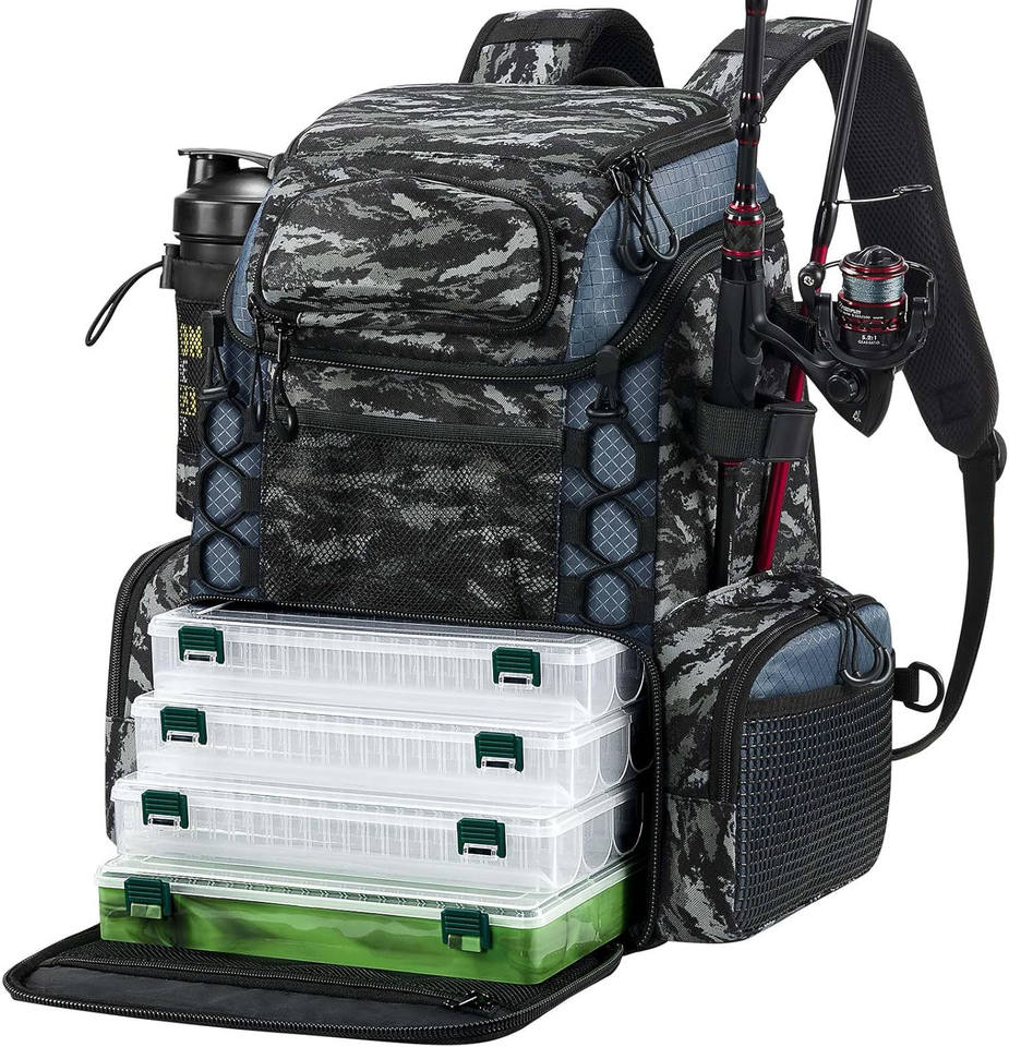 กระเป๋าตกปลาแบบสะพายหลังสำหรับกิจกรรมกลางแจ้ง พร้อมที่ใส่คันเบ็ดและกล่องอุปกรณ์ตกปลา 4 กล่อง (ตัวอย่างสินค้าฟรี)