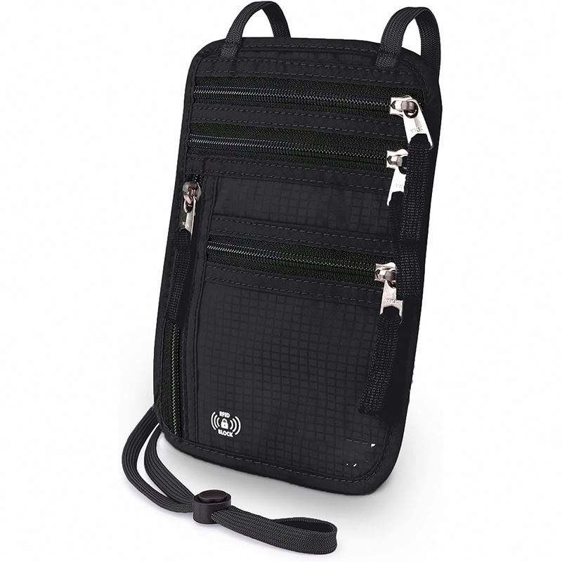 กระเป๋าใส่พาสปอร์ตแบบคล้องคอ RFID สีดำ สำหรับเดินทาง พร้อมช่องใส่บัตรประชาชน ตัวอย่างสินค้าฟรี ขายส่ง