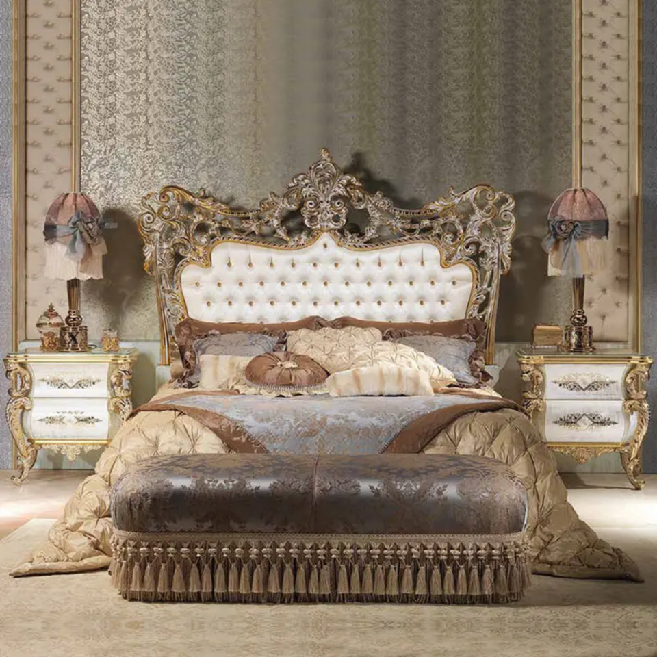 จัดส่งฟรี เฟอร์นิเจอร์บ้าน Kiky รุ่น BD-LUX01 เตียงคิงไซส์ไม้มะฮอกกานีสีทองหรูหรา สไตล์ฝรั่งเศส พร้อมชุดห้องนอนแกะสลักอย่างประณีต