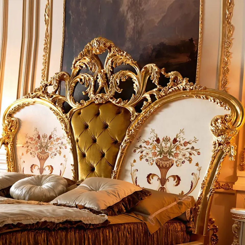 จัดส่งฟรี เฟอร์นิเจอร์บ้าน Kiky รุ่น BD-LUX04 เตียงคิงไซส์หุ้มเบาะไม้มะฮอกกานีสีทองหรูหราสไตล์ยุโรป ชุดห้องนอน