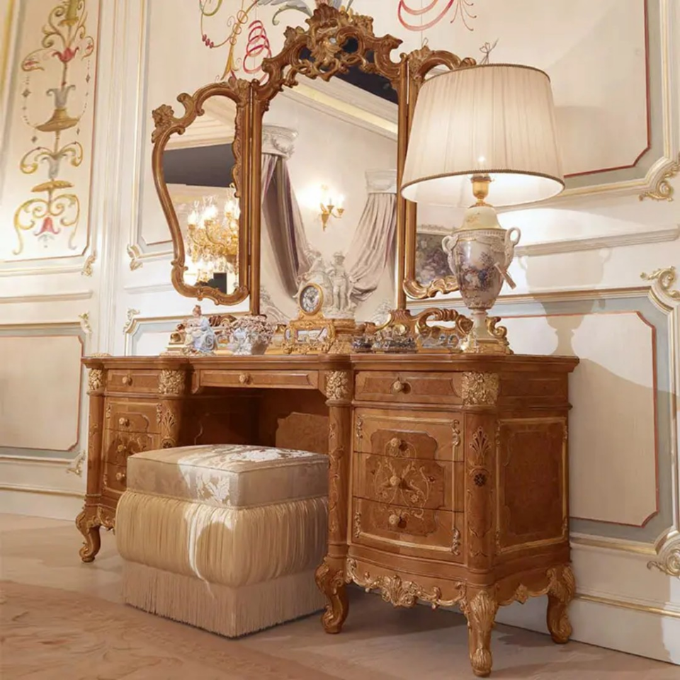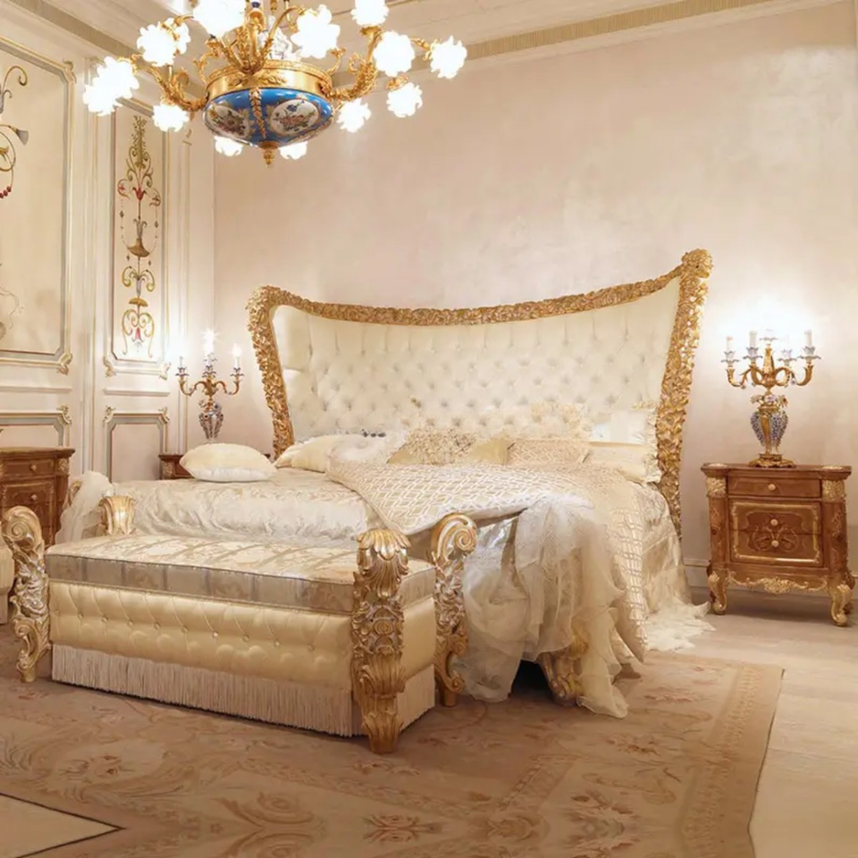 ชุดห้องนอนขนาดคิงไซส์ หัวเตียงไม้มะฮอกกานีสีทองหรูหรา ส่งฟรี เฟอร์นิเจอร์แกะสลักสไตล์ยุโรปโบราณ ผลิตในอินโดนีเซีย