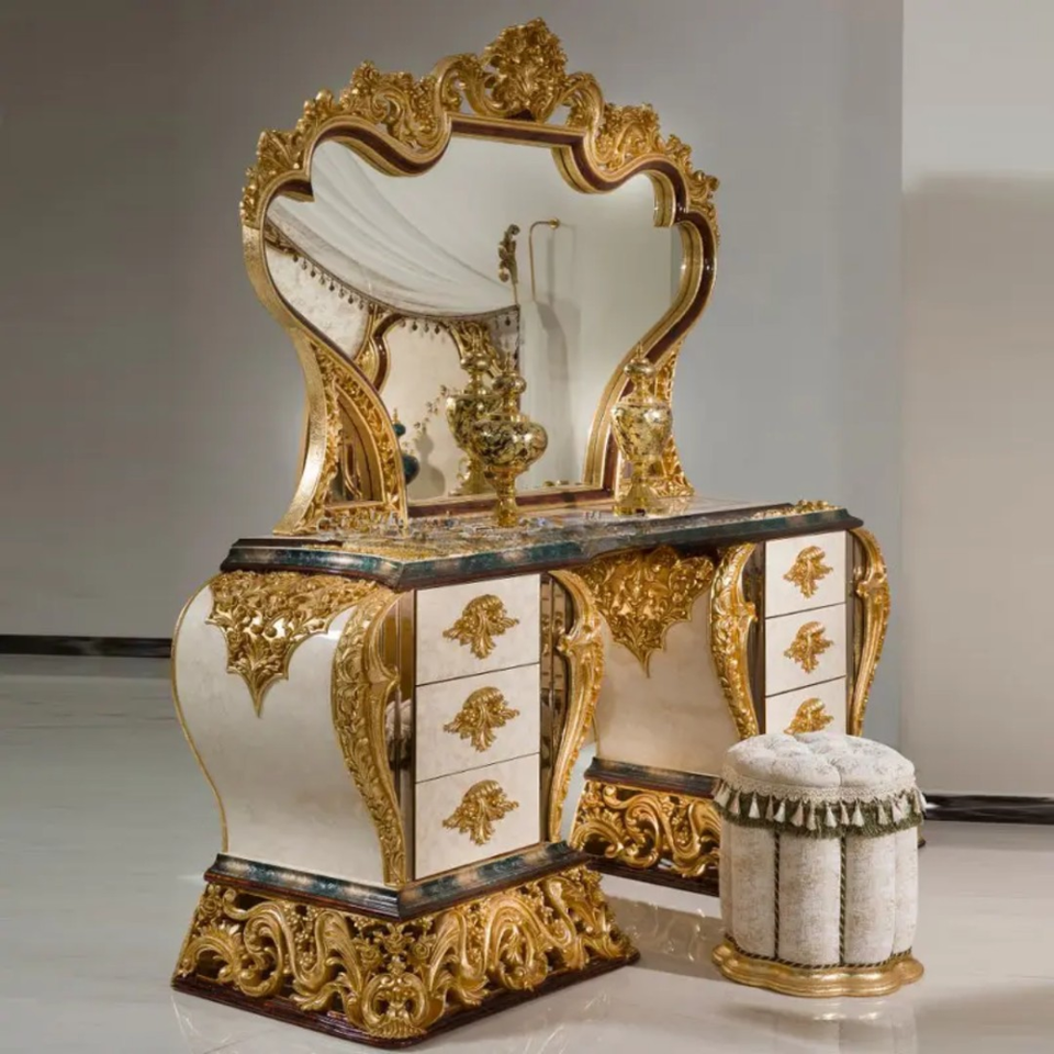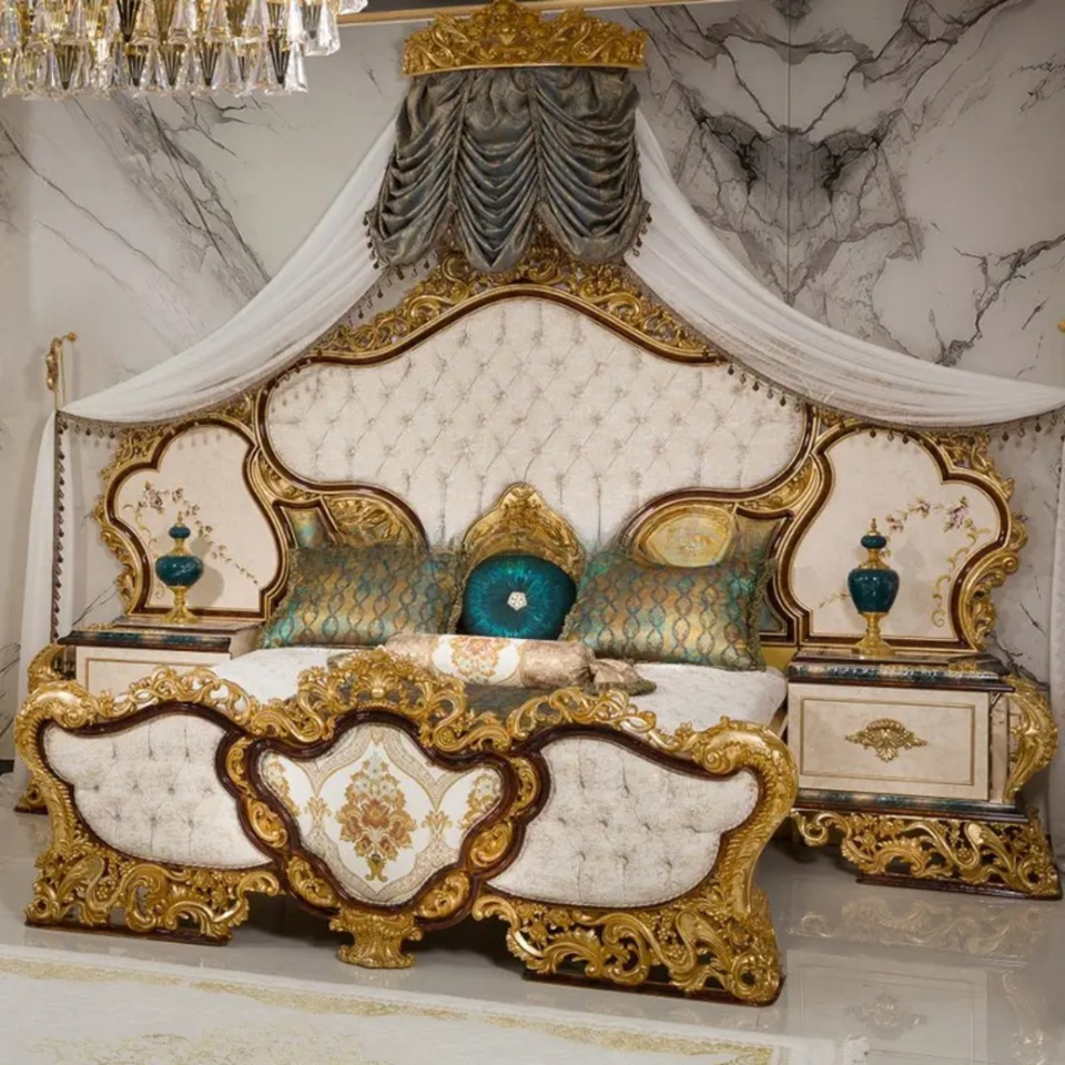 ชุดห้องนอนสไตล์ยุโรปโบราณขนาดคิงไซส์ ทำจากไม้มะฮอกกานีสีทองหรูหรา พร้อมเตียงแบบมีหลังคาและหัวเตียงแบบ Tufted ผลิตในอินโดนีเซีย จัดส่งฟรี