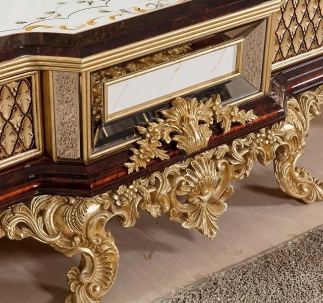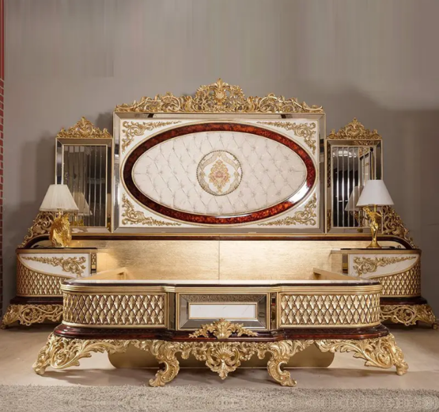 ชุดห้องนอนขนาดคิงไซส์ ไม้มะฮอกกานีแท้ สีทองหรูหรา สไตล์ยุโรป แกะสลักอย่างประณีต ผลิตในอินโดนีเซีย ยี่ห้อ Kiky จัดส่งฟรี
