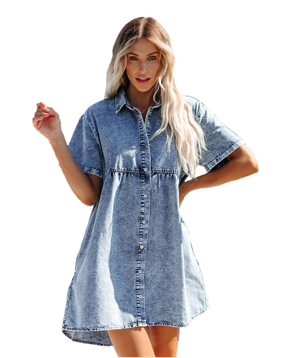 จัดส่งฟรี แฟชั่นดีไซน์ใหม่ ตลาดอเมริกา 2022 ผ้าฝ้าย 100% ชุดเดรสลำลองฤดูร้อน ผ้าเดนิมธรรมชาติ ทอเรียบ ทรงเอ ความยาวระดับเข่า