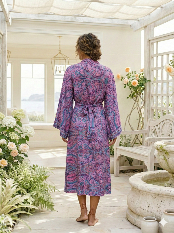 ฟรีไซส์ เสื้อคลุมกิโมโนสไตล์เกาหลี ลายเรขาคณิต Y2K โบฮีเมียนธรรมชาติ ผ้าไหมทอแบบอินเดีย ทรงเอไลน์ ความยาวปานกลาง คอวี แขนยาว สำหรับฤดูร้อน