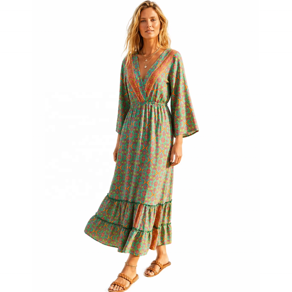 เดรสทรงเอไลน์ยาวคลุมเท้า คอวี เอวสม็อค ชายระบาย ผ้าไหมทอมือสไตล์โบโฮ ลายเรขาคณิตเกาหลี Y2K ไซส์ฟรี เรียบง่ายสำหรับฤดูใบไม้ผลิ