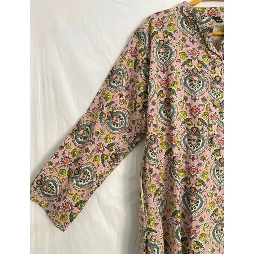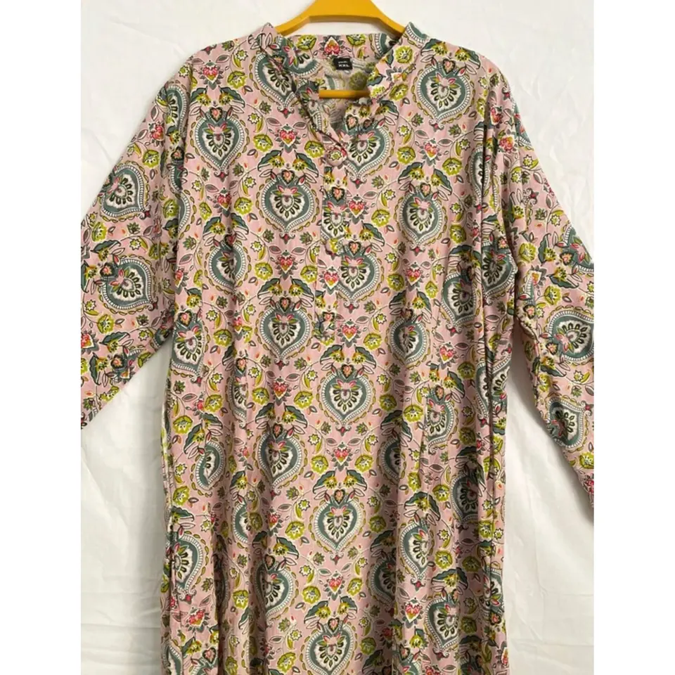 เดรสผ้าฝ้ายสีน้ำตาลอ่อน ฟรีไซส์ คอวี ลายดอกพิมพ์บล็อก สไตล์โบโฮ ระบายอากาศได้ดี เหมาะสำหรับใส่ไปเที่ยวชายหาด งานปาร์ตี้ หรือใส่สบายๆในวันสบายๆ ทรงหลวม ไซส์ XS