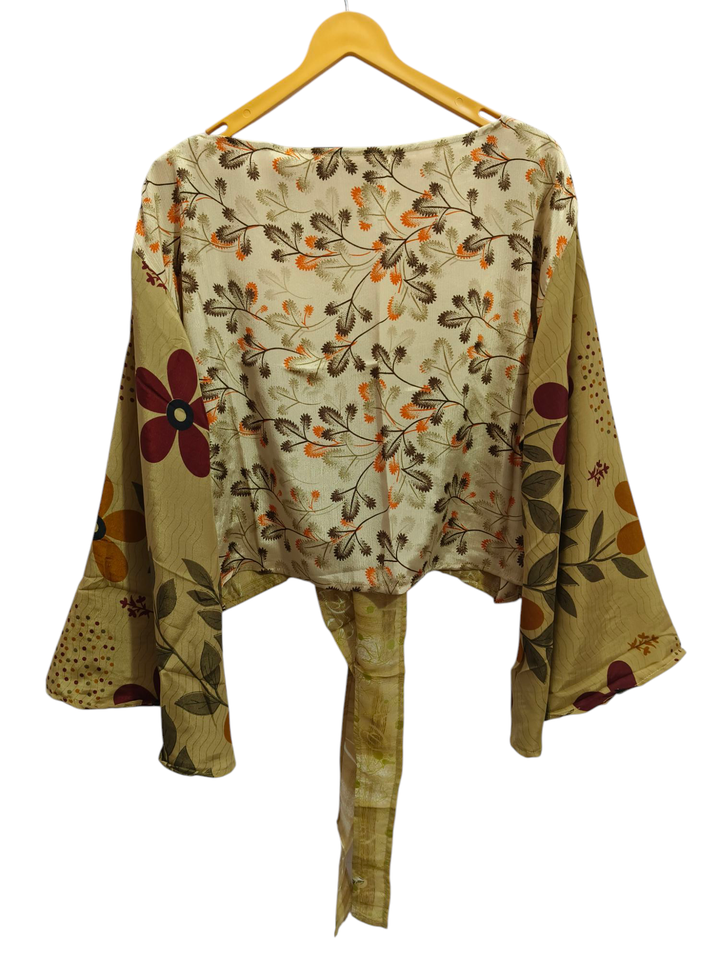 เดรสผ้าไหมหลากสีสำหรับผู้หญิงเสื้อครอปรอบแขนกระดิ่งผูกเชือกเสื้อครอปรอบฤดูร้อนฟรีไซส์