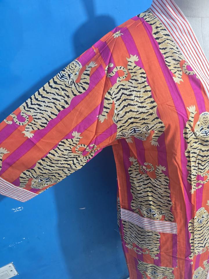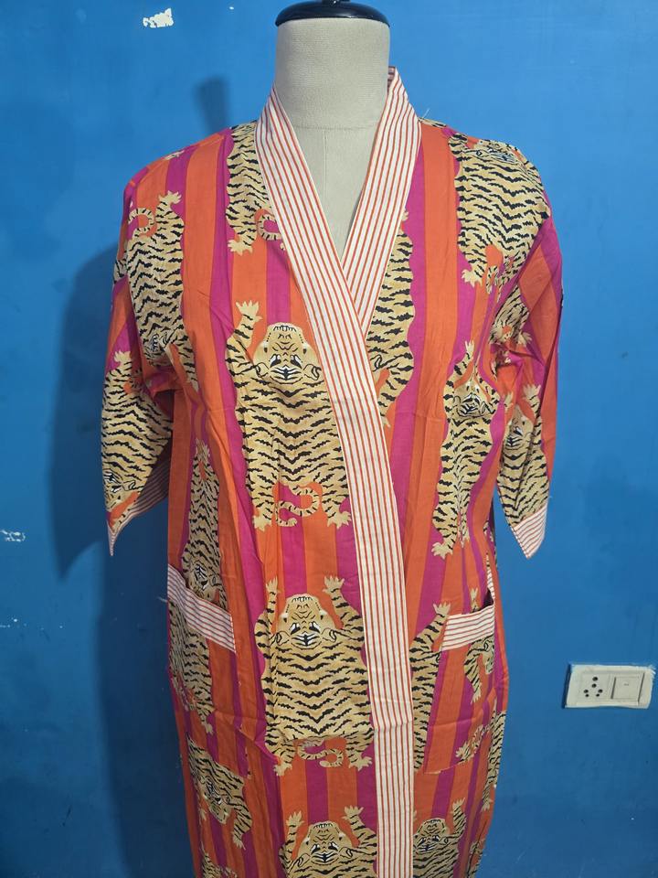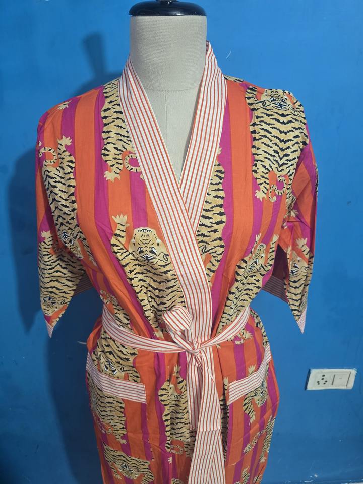 ชุดคลุมกิโมโนลายเสืออินเดียสำหรับผู้หญิง ฟรีไซส์ ผ้าฝ้าย 100% คุณภาพสูง ชุดคลุมอาบน้ำสำหรับฤดูร้อน พร้อมเข็มขัดปรับได้ สำหรับชุดนอนฤดูใบไม้ผลิ