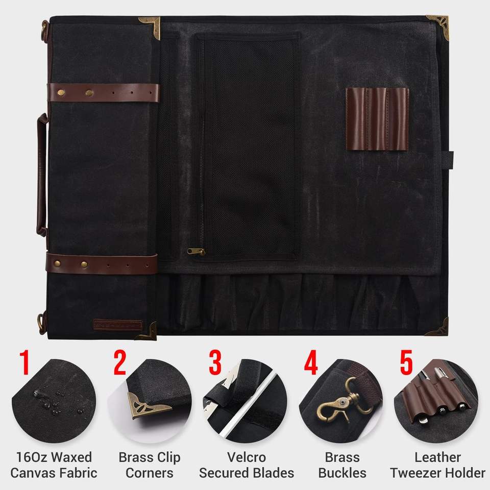 กระเป๋าใส่มีดเชฟแบบม้วน ตัวอย่างฟรี 20 ช่อง สำหรับใส่มีดและอุปกรณ์ครัว ผลิตจากไนลอนเคลือบแว็กซ์กันเปื้อน เหมาะสำหรับนักเรียนทำอาหาร