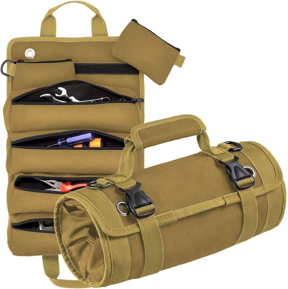 กระเป๋าเครื่องมืออเนกประสงค์แบบม้วนเก็บได้ ผ้าแคนวาส กระเป๋าจัดระเบียบเครื่องมือ กระเป๋าใส่ชุดปฐมพยาบาลในรถยนต์ กระเป๋าเก็บของแบบม้วน