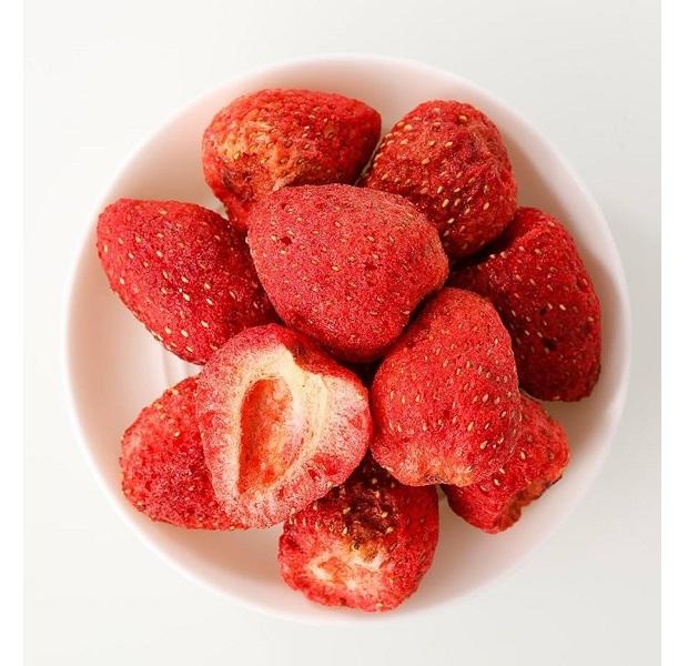 สตรอเบอรี่แช่แข็งแห้งทำจากสตรอเบอรี่สุกจริงขนมกรอบและหวานอย่างเป็นธรรมชาติเหมาะสำหรับสมูทตี้
