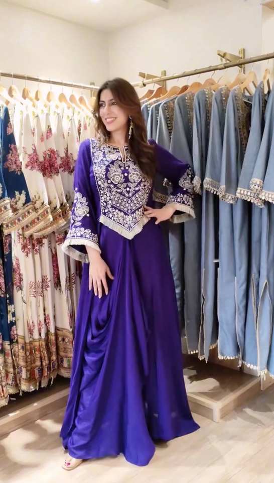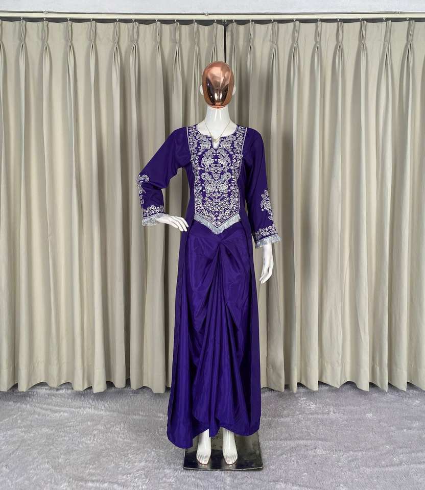 ชุดเสื้อปักลายและ dhoti ผ้าเครปฝรั่งเศสพร้อมไมโครด้านในและเย็บเต็มรูปแบบสำหรับผู้หญิงที่มีขนาด M L XL และ XXL