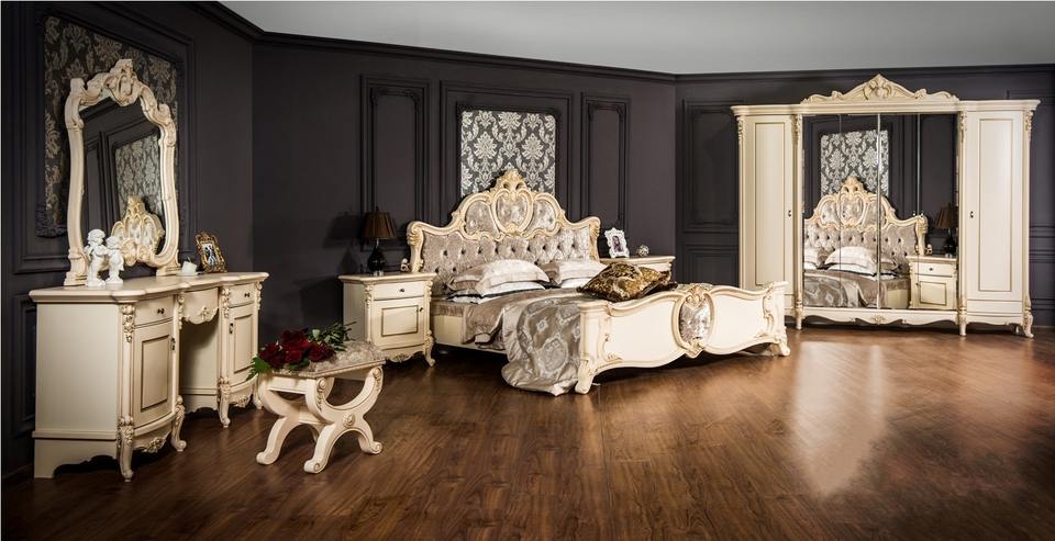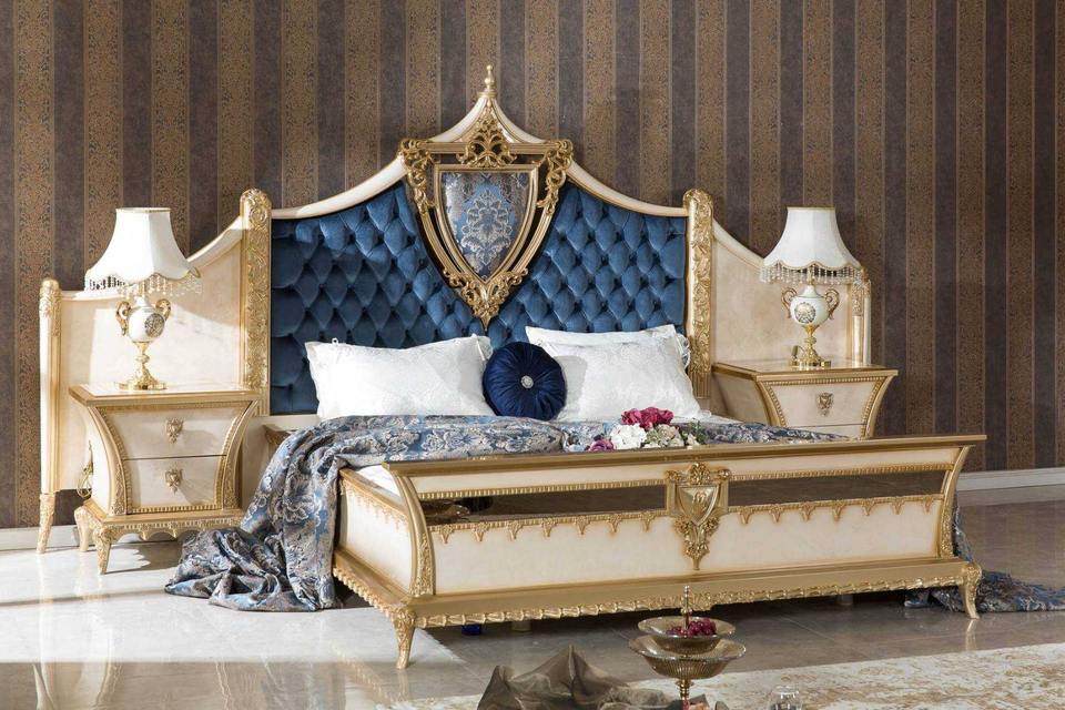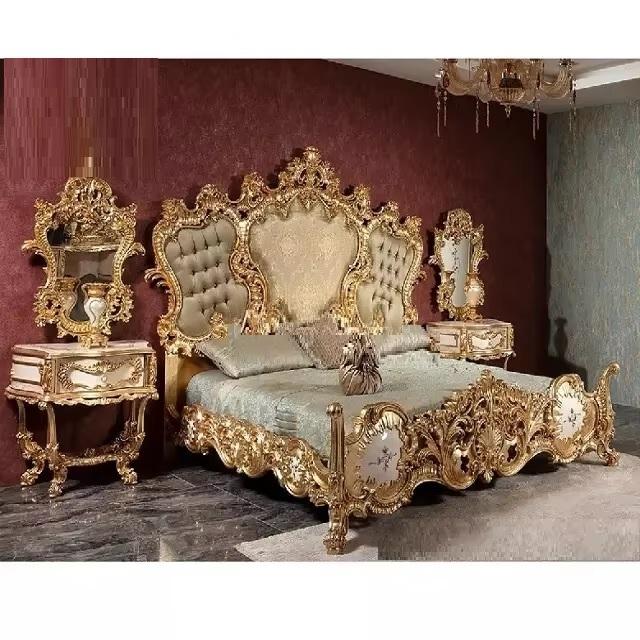 เตียงไม้สักแกะสลักรูปกุหลาบสีทองฝรั่งเศสและขาตั้งกลางคืนชุดห้องนอนแบบมืออาชีพที่ทันสมัยตกแต่งด้วยผิวสีทองแบบราชวงศ์