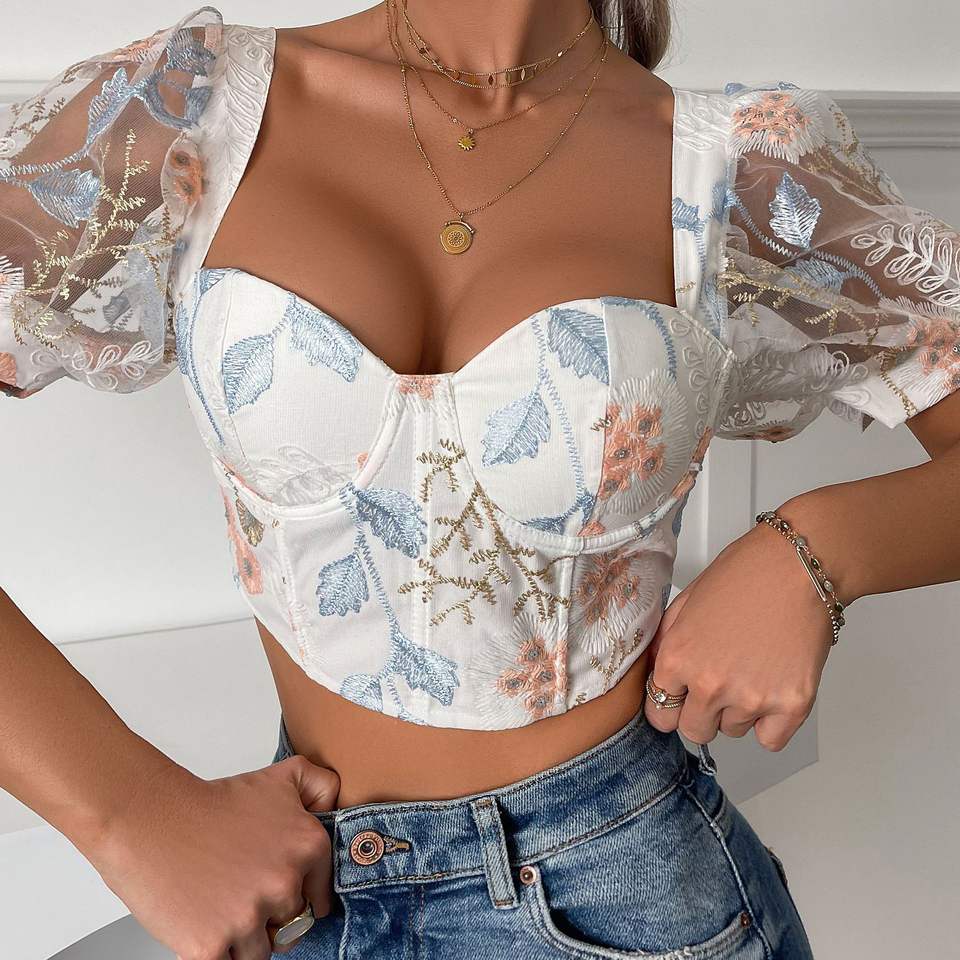 เสื้อครอปทรงเข้ารูป ดีไซน์หรูหราสไตล์ฝรั่งเศส แขนพองแต่งลูกไม้ พิมพ์โลโก้ 3 มิติ เซ็กซี่ ลำลอง ไซส์ XL ผ้าฝ้ายทอ สไตล์ฤดูร้อน