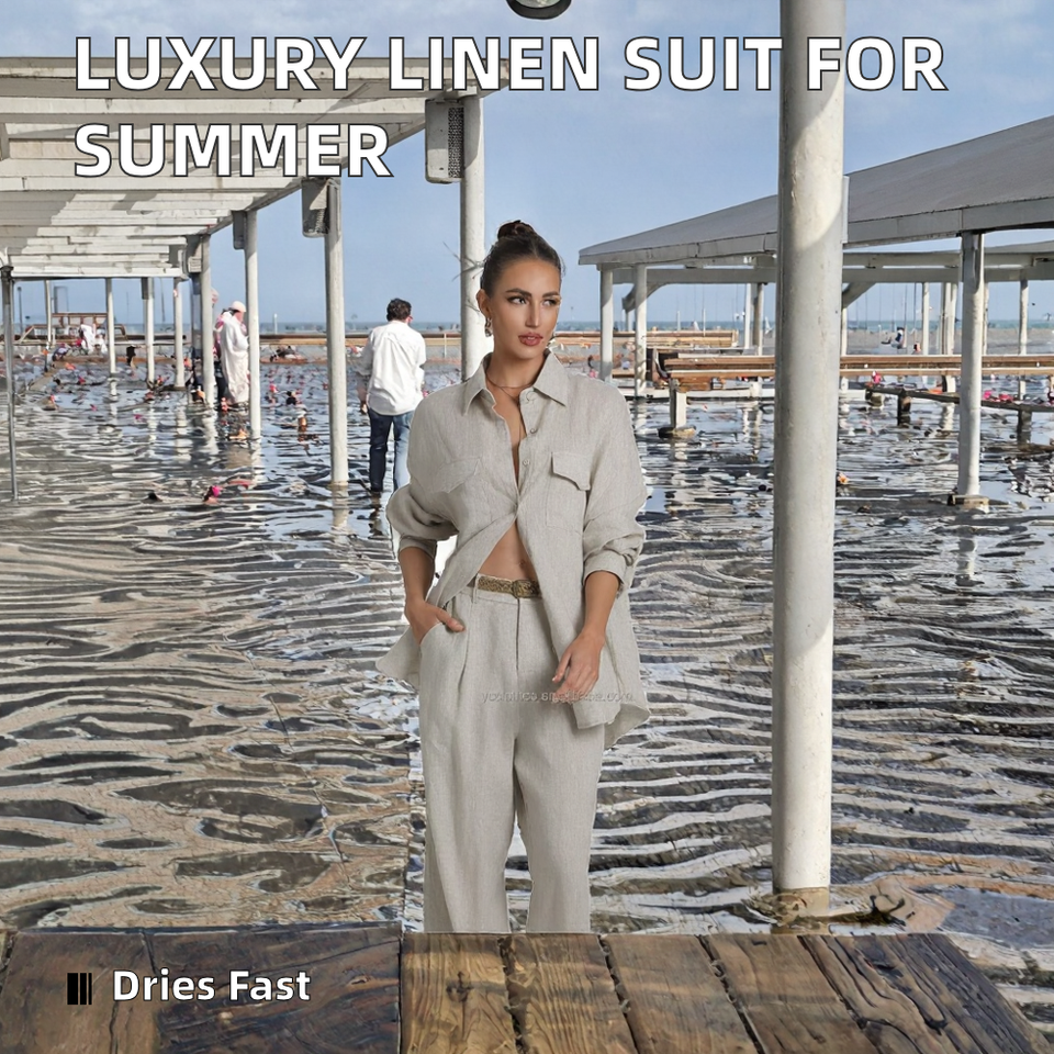 ชุดสูทผ้าลินินผู้หญิงระดับไฮเอนด์สไตล์ฝรั่งเศส เสื้อเชิ้ตผ้าขนสัตว์ 100% กางเกงขาสั้น สีพื้น ป้องกันแสงแดด ใช้งานได้หลากหลายสำหรับฤดูใบไม้ผลิ/ฤดูร้อน สไตล์ลำลอง ย้อมสีเรียบ