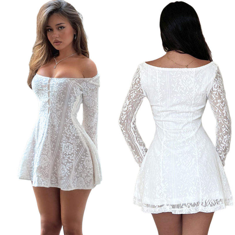 เดรสสั้นลูกไม้สไตล์ฝรั่งเศสวินเทจ - เดรสเซ็กซี่สำหรับผู้หญิง ทรงเอไลน์ ลายดอกไม้ เหมาะสำหรับงานปาร์ตี้ เอวธรรมชาติ ย้อมสีธรรมชาติ เป็นมิตรต่อสิ่งแวดล้อม