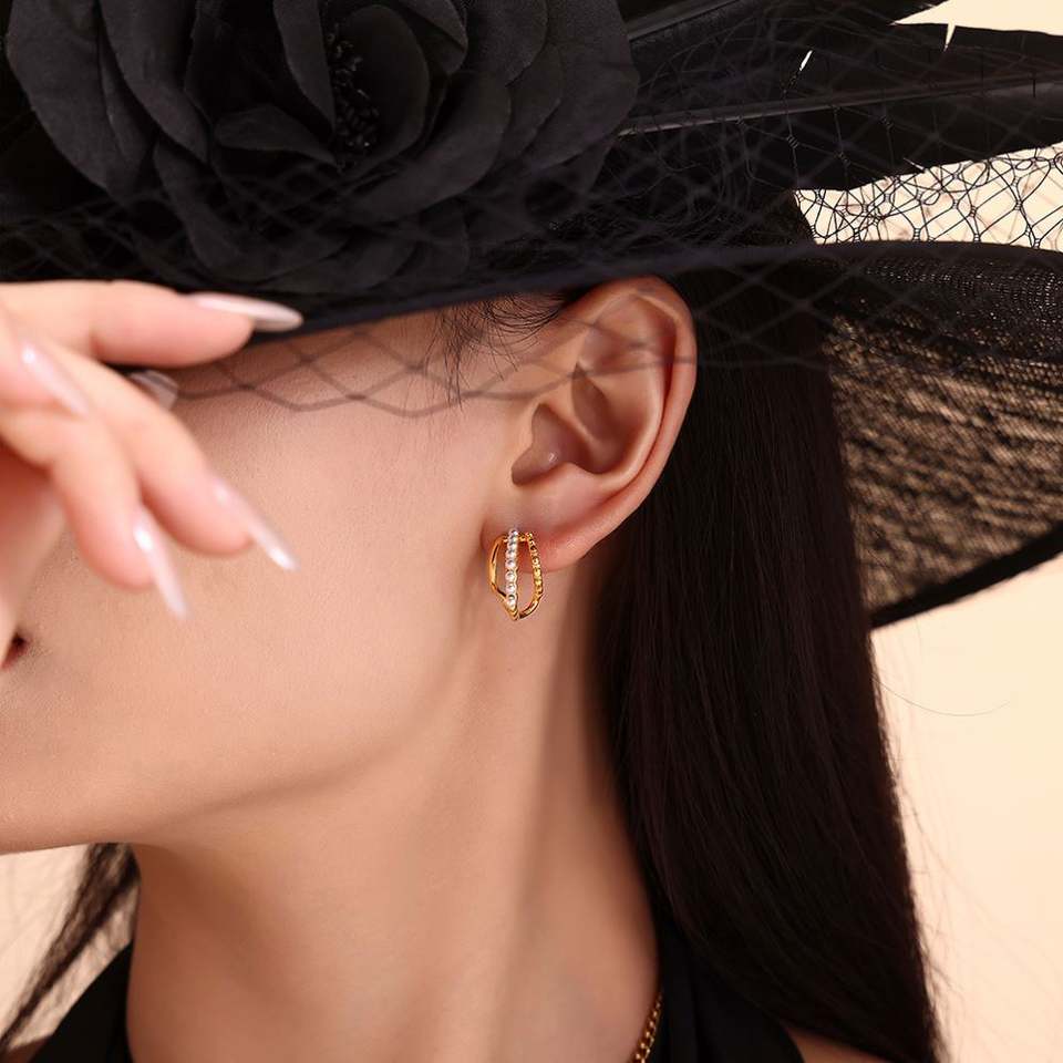 ต่างหูสไตล์ฝรั่งเศสที่หรูหราน้ำหนักเบาทำจากสแตนเลสชุบด้วยทอง18K ต่างหูมุกเทียมรูปทรงเรขาคณิตแบบย้อนยุคกลวงหลายชั้น