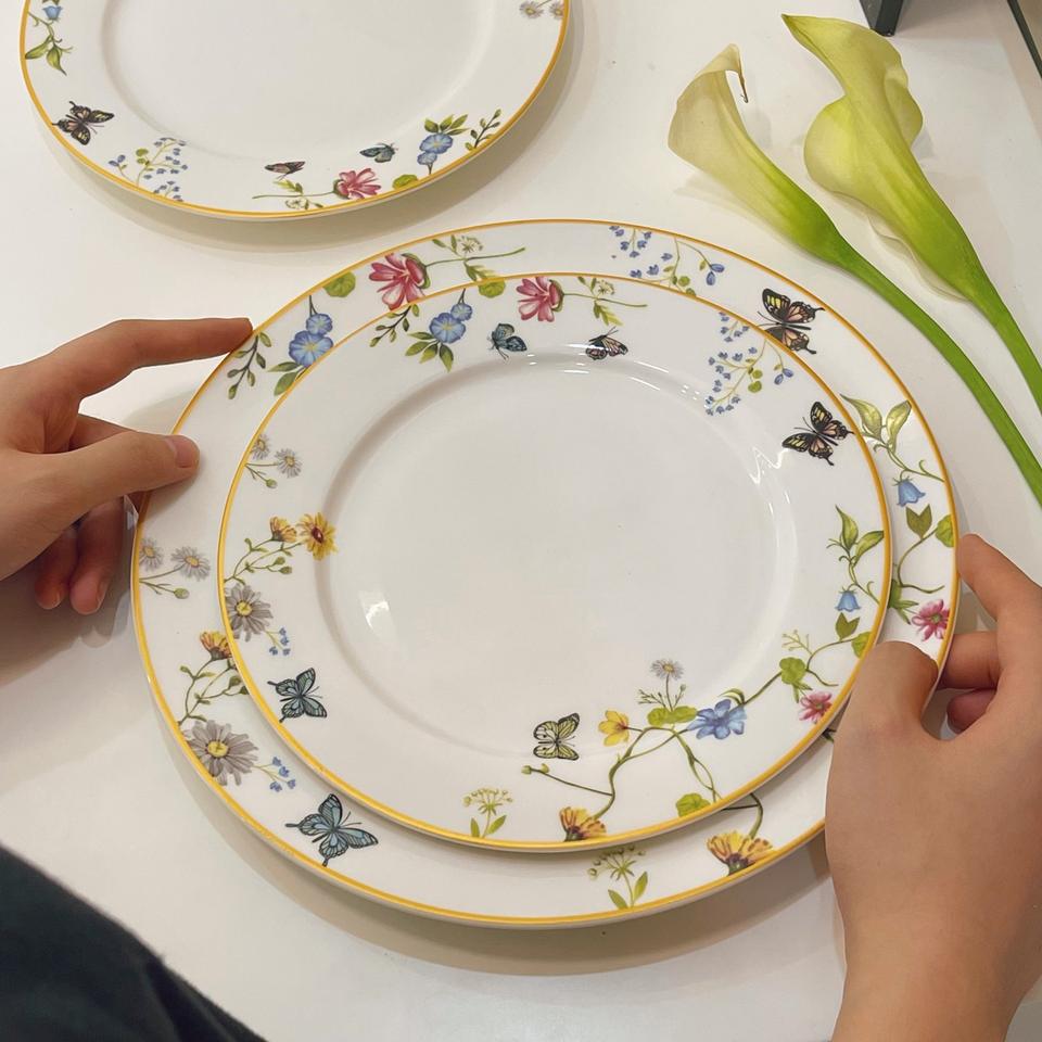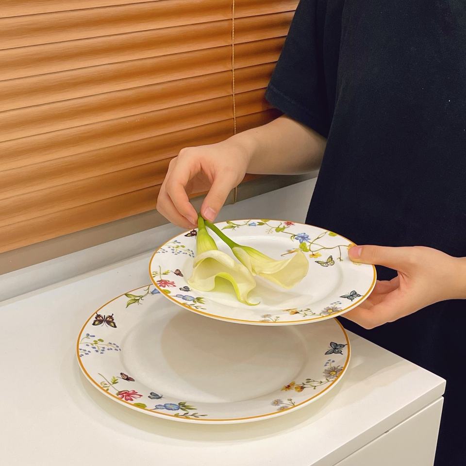 จานเซรามิกสไตล์ย้อนยุคฝรั่งเศสจานขนมอาหารตะวันตกแบบหรูหราแบนทรงผีเสื้อลายดอกไม้สำหรับใช้ในครัวเรือน