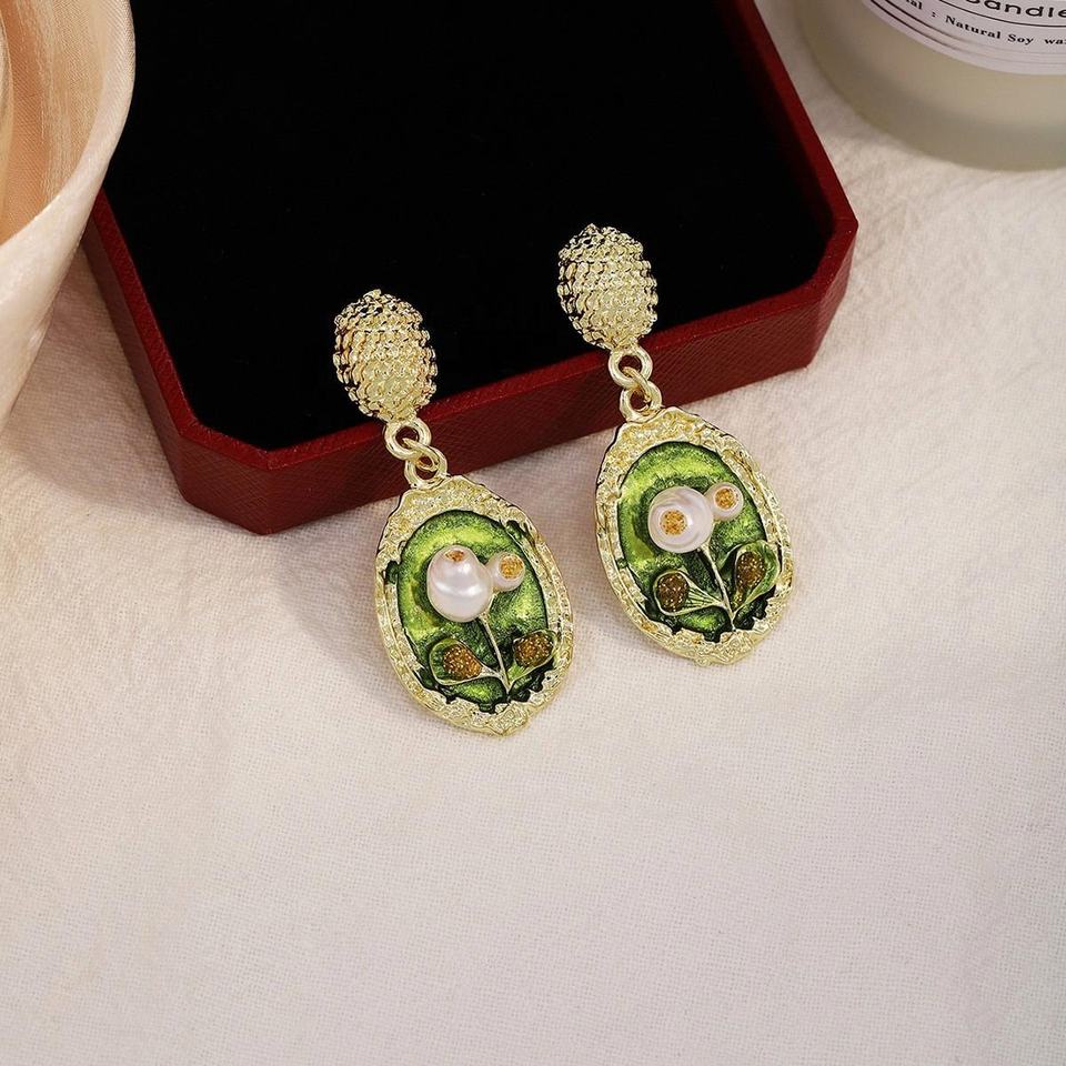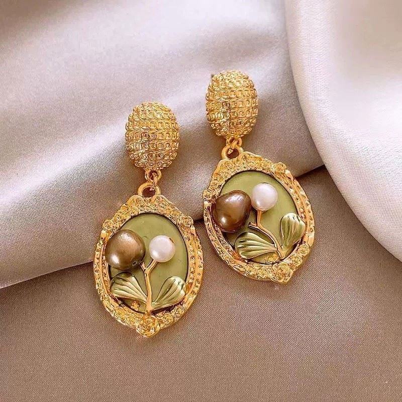 ต่างหูรูปดอกไม้สไตล์ฝรั่งเศสย้อนยุคสีเขียวแบบภาพวาดสีน้ำมัน ประดับมุกสไตล์บาโรกหรูหราเบาๆ สำหรับงานปาร์ตี้สีทองสุดอินเทรนด์