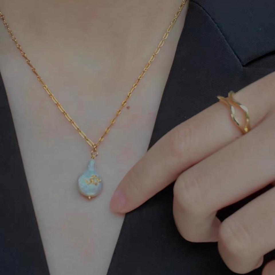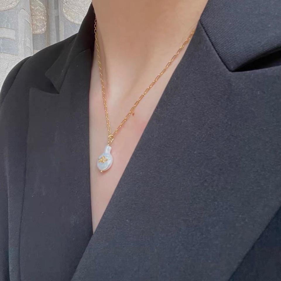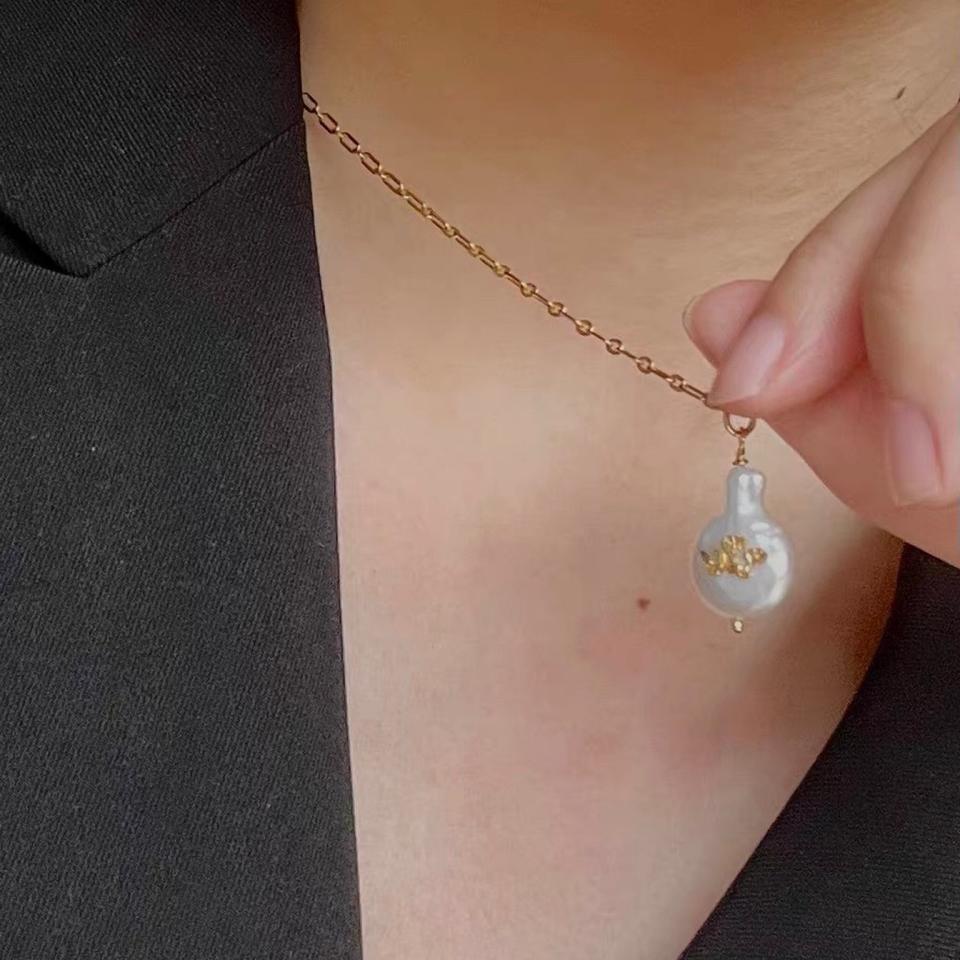 สร้อยคอจี้แจกันลายดอกไม้สไตล์ฝรั่งเศสย้อนยุคแบบเฮปเบิร์น ผ้าลินินแท้ธรรมชาติ ประดับมุกสีเทาเงิน ลายฟอยล์ทอง สร้อยคอประดับกระดูกไหปลาร้า