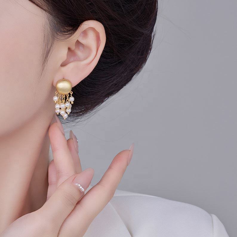 ต่างหูแบบติดหูสไตล์เรโทรฝรั่งเศส ดีไซน์เรขาคณิต หรูหรา ชุบทอง 18K ประดับมุกทรงเจ้าหญิง พร้อมพู่ห้อย ของขวัญสำหรับผู้หญิง