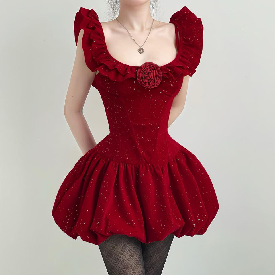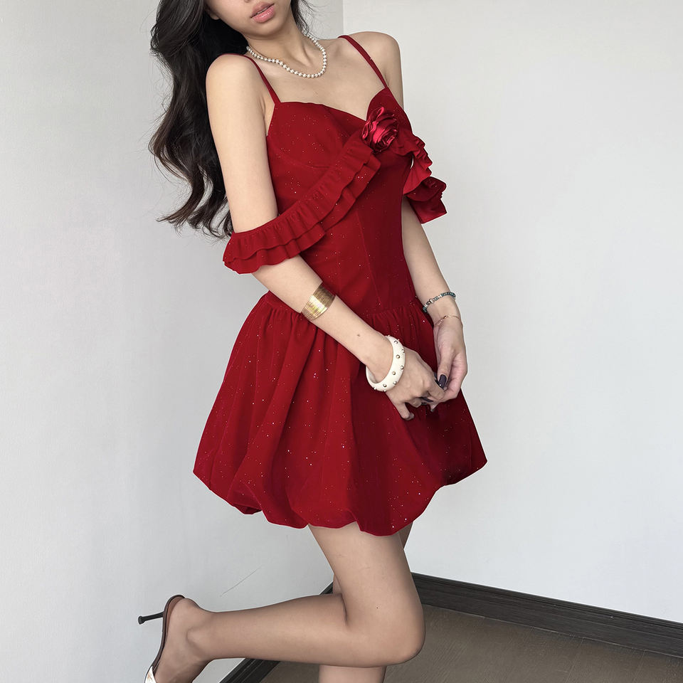 เดรสสายเดี่ยวประดับเลื่อมระยิบระยับสไตล์ฝรั่งเศส แต่งระบายช่วงเอว กระโปรงทรงบับเบิ้ล ความยาวมินิ เหมาะสำหรับงานปาร์ตี้สำหรับผู้หญิง