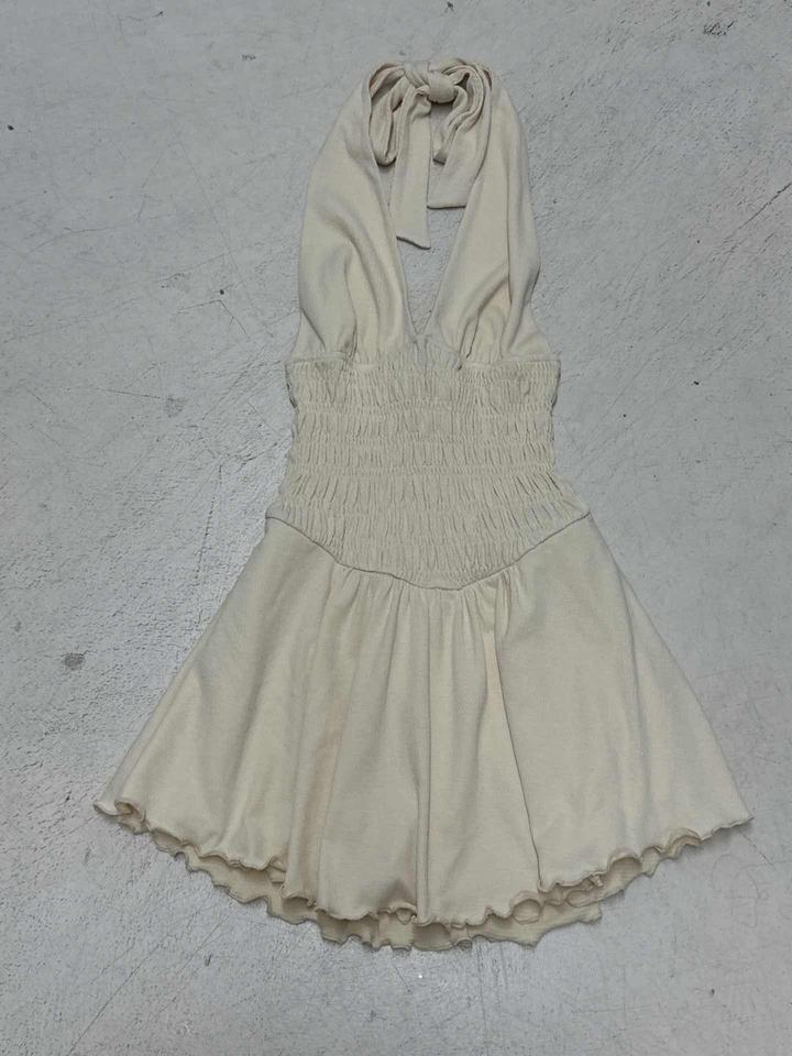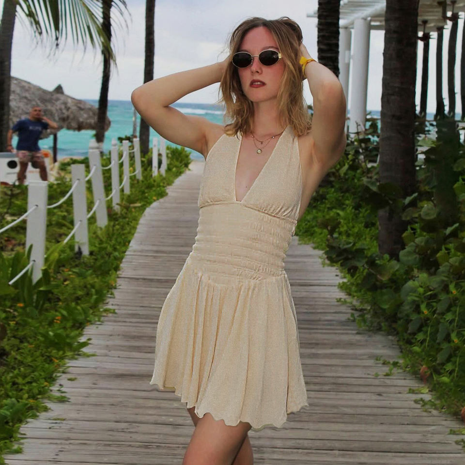 เดรสสั้นสไตล์ฝรั่งเศสสีเหลืองโรแมนติก แต่งระบายช่วงเอว คอวีผูกหลัง เปิดหลังผูกเชือก ทรงสวยเหมาะกับวันพักผ่อน
